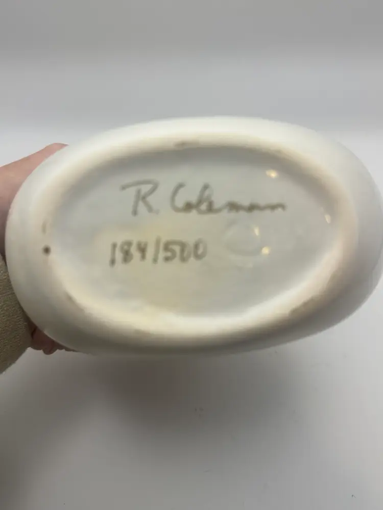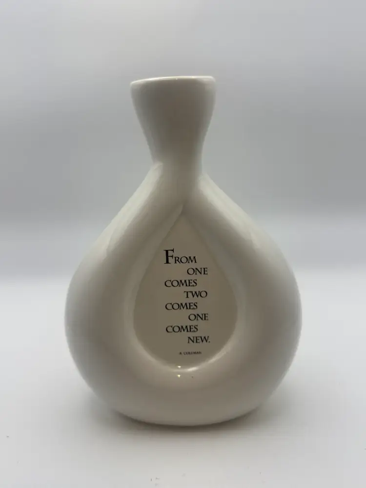 White ceramic R. Coleman vase with the inscription "FROM ONE COMES TWO COMES ONE COMES NEW." Signed By R. Coleman.
