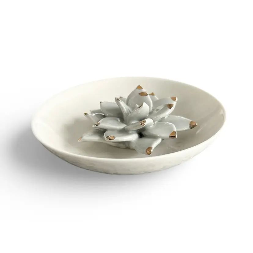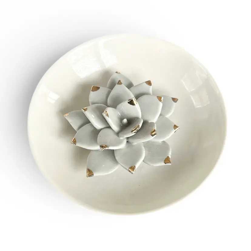 Keep your treasures safe with this elegant white ceramic dish featuring a delicate succulent design. Perfect for jewelry or small keepsakes. Size: 4”