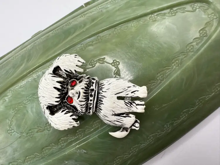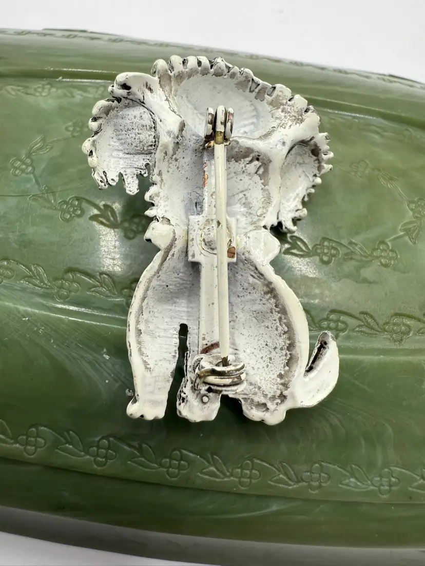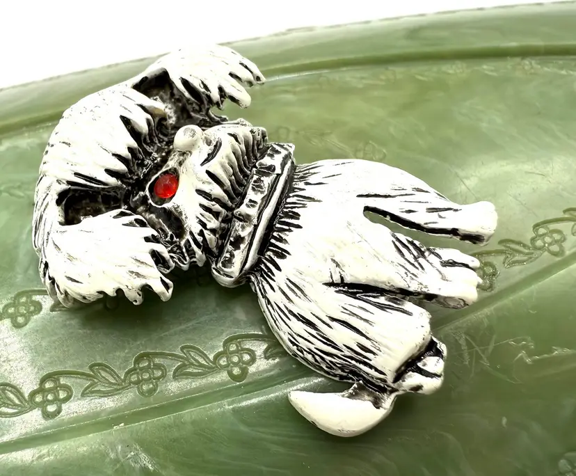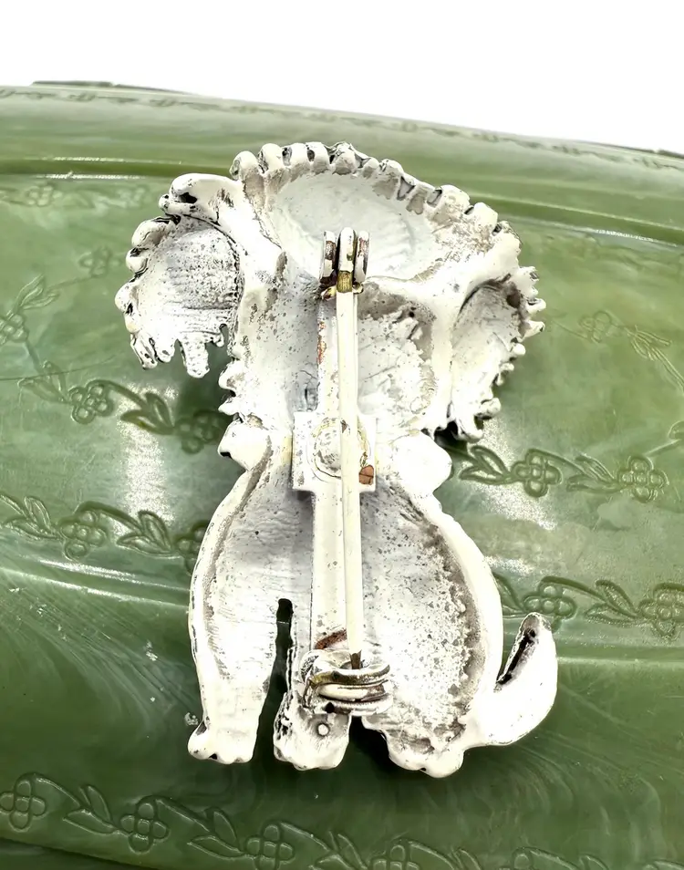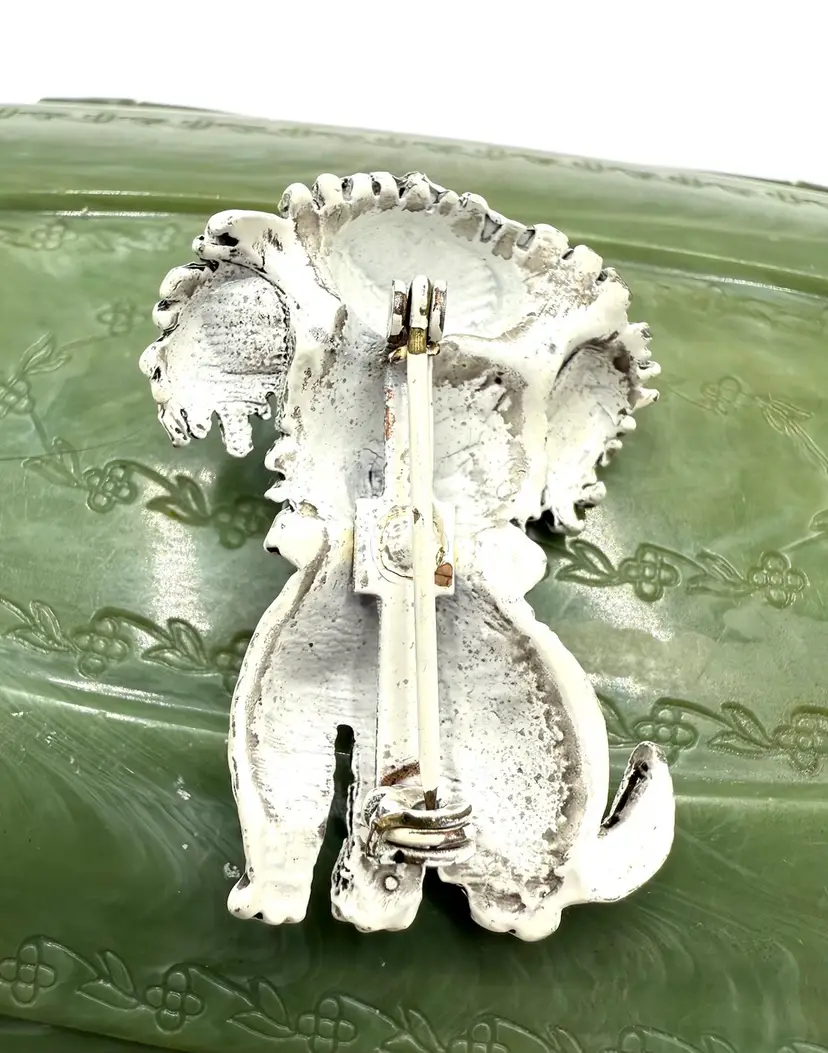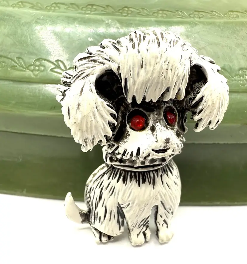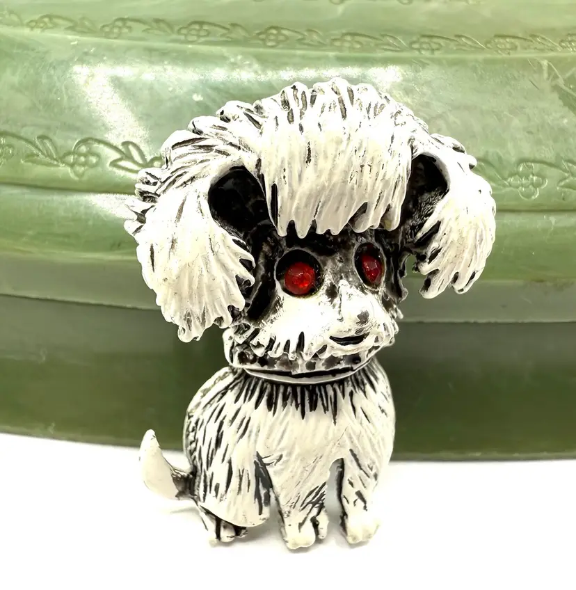 Such a fun white fluffy dog brooch unsigned with great red rhinestone eyes. This pin would be a perfect gift for that dog owner who loves the poodle, Yorkie, Maltese or any white dog. Set in white enamel, and so hard to find in great condition. Hallmark: unsigned Size: 1 3/4 inches wide by 1 1/4 inches tall - Condition; vintage excellent