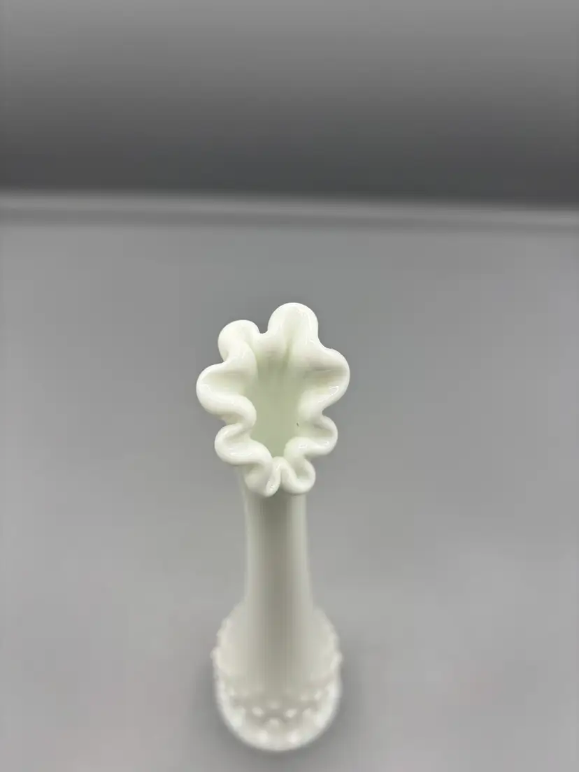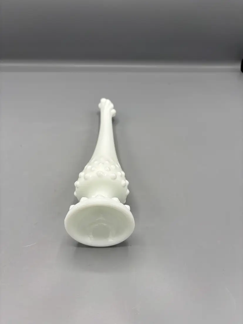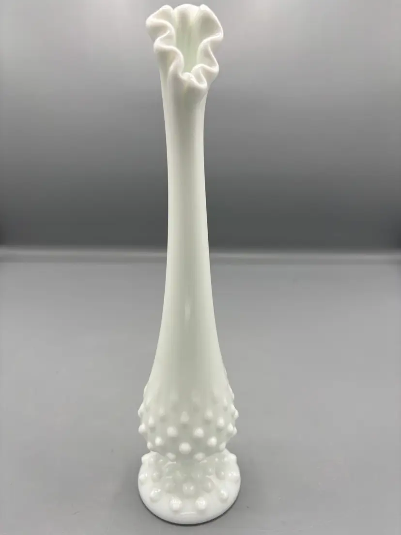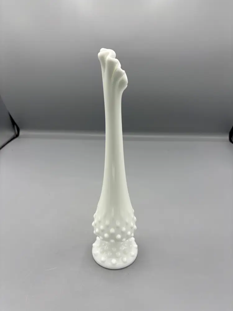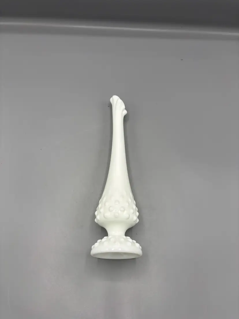 Elegant white milk glass bud vase featuring Fenton's iconic hobnail pattern. This graceful swung-style vase stands 10 inches tall, making it perfect for displaying a single stem or small floral arrangement. The textured hobnail design catches light beautifully, adding vintage charm to any shelf, dresser, or windowsill. A timeless collectible piece that brings classic mid-century appeal to your home décor.
