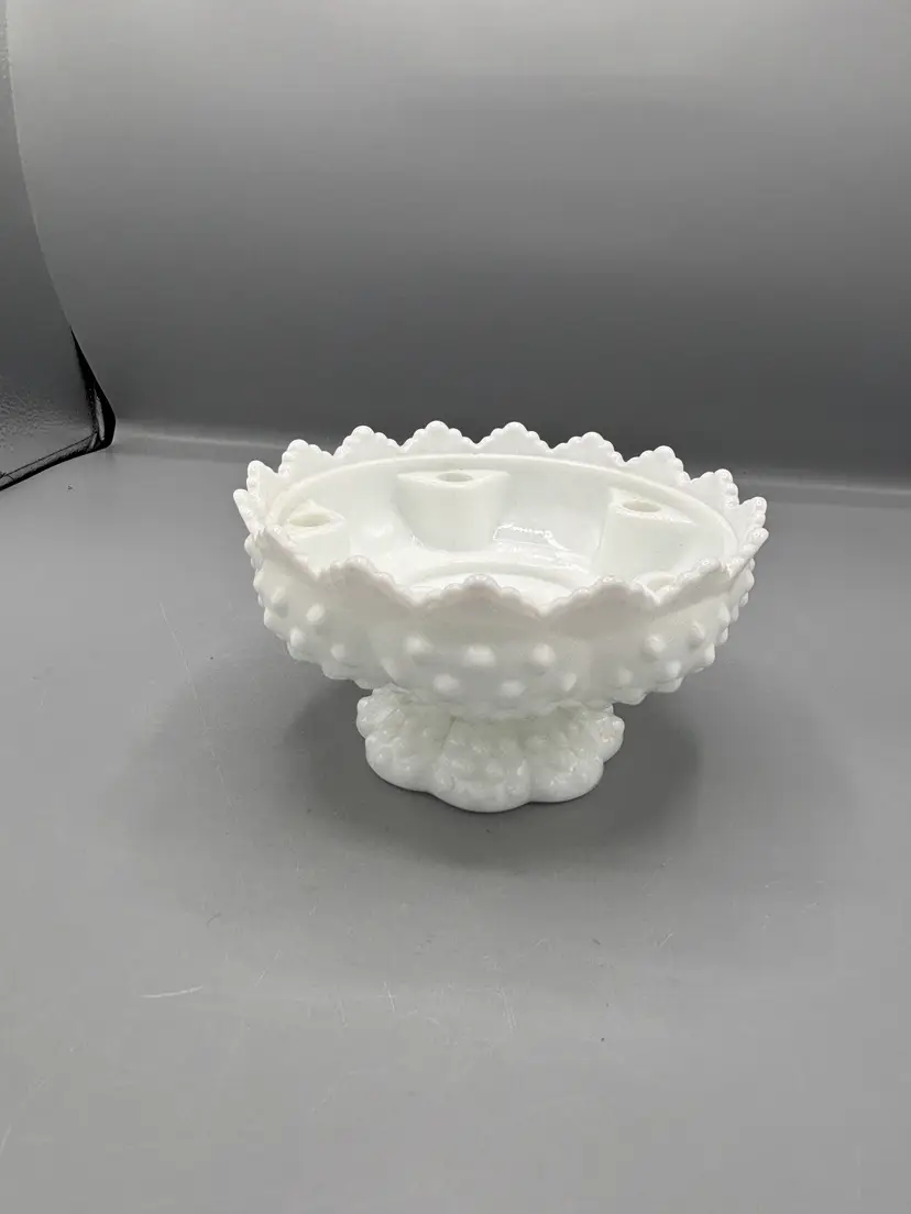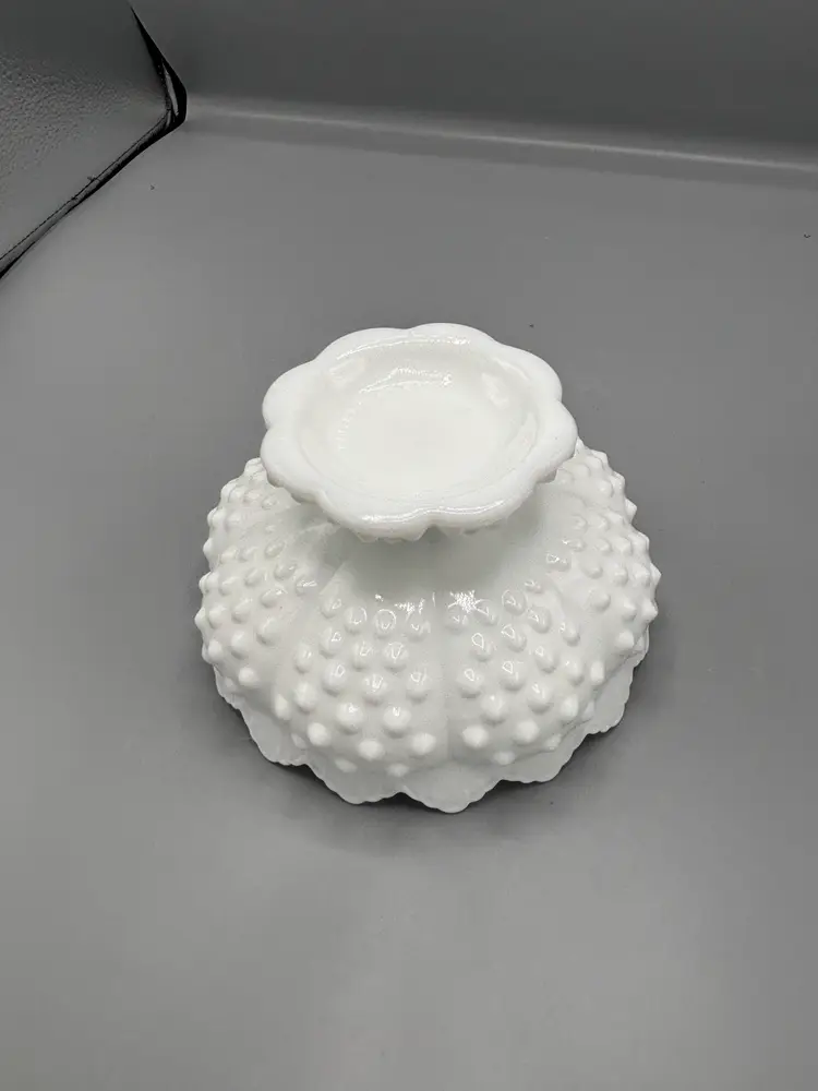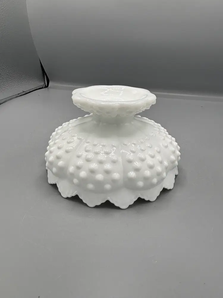 Elevate your table setting with this charming White Fenton hobnail milk glass candle holder. Featuring the iconic hobnail texture that Fenton is renowned for, this footed design brings vintage elegance to any room. Standing 6 1/4 inches tall with a 3 1/2-inch base, it's the perfect size for standard taper candles. The milky white glass catches candlelight beautifully, creating a warm, inviting ambiance. A timeless piece for collectors and decor enthusiasts alike.