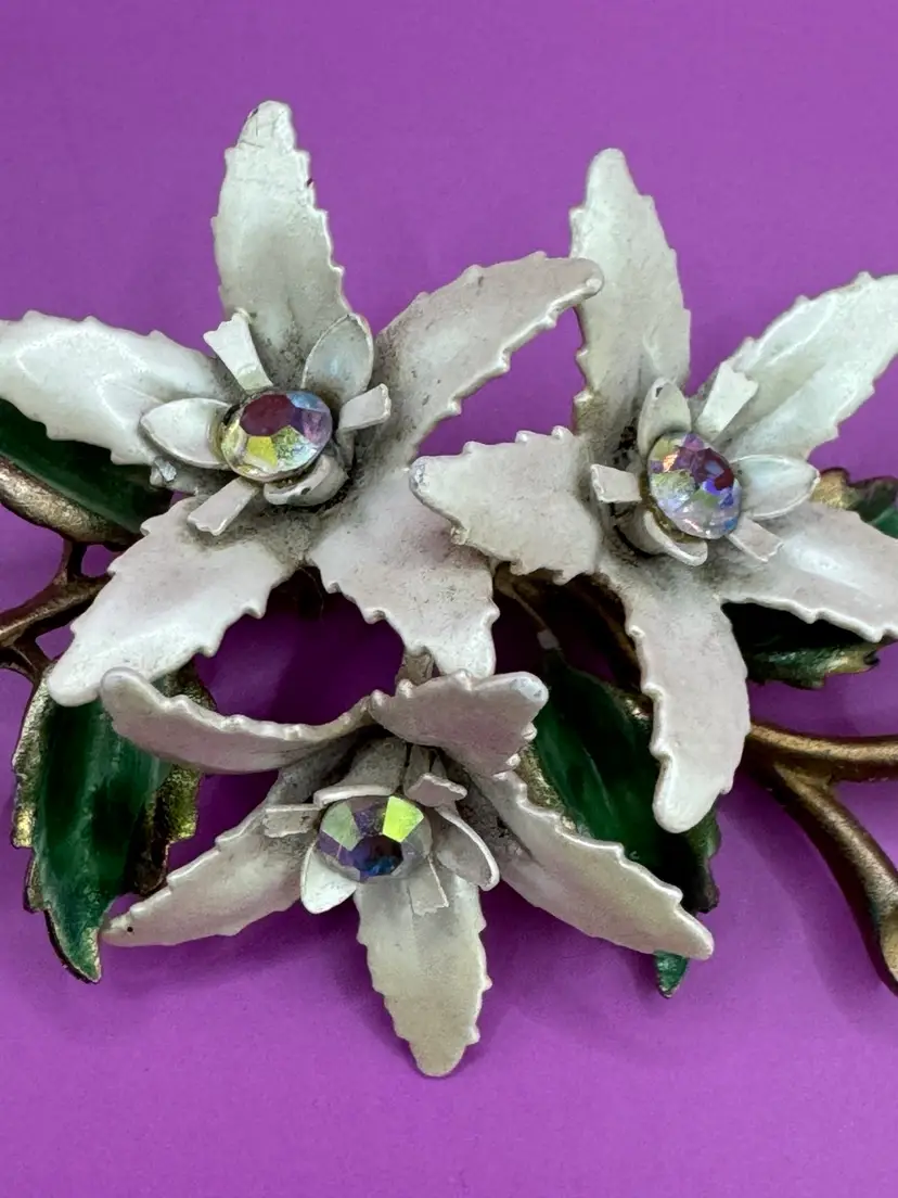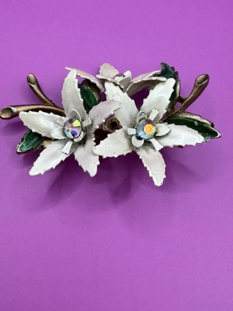 Flower brooch with beautiful center aurora borealis stone. Metal riveted. Size 2" x 2 1/2"