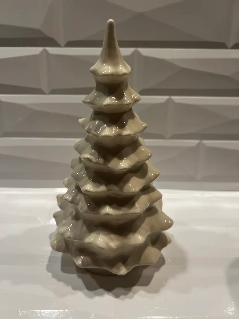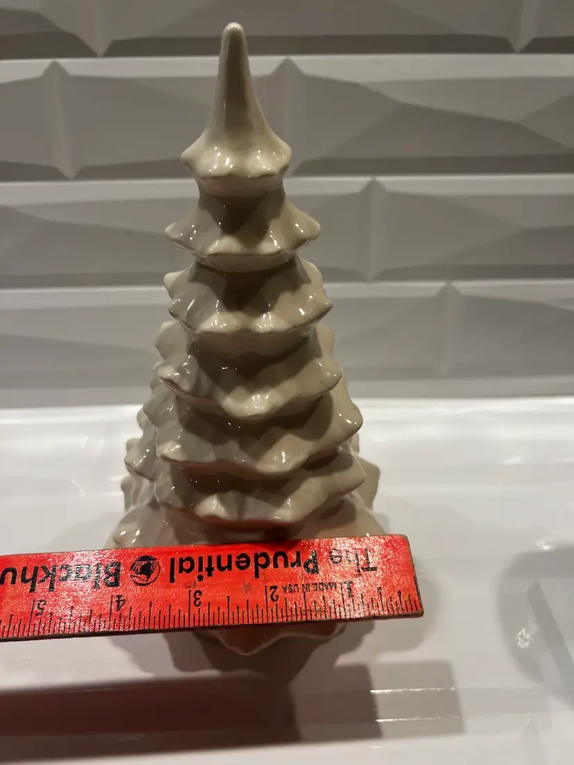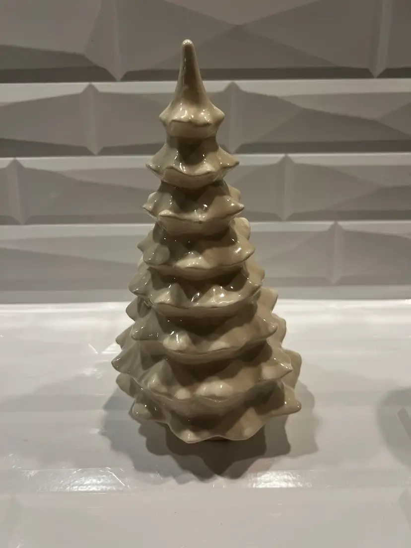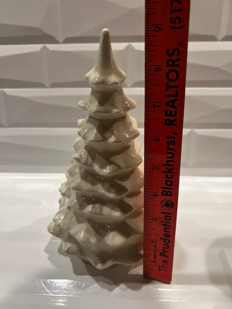 Simple white glazed ceramic tree, unlit, undecorated, one to tuck in your village, place on a coffee bar, or on your mantle! Good condition 9”
