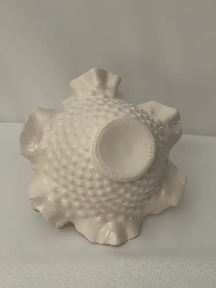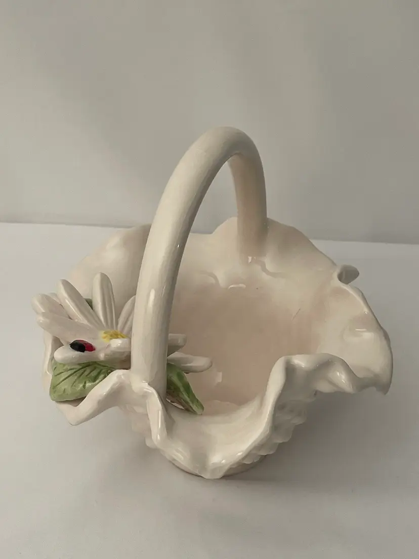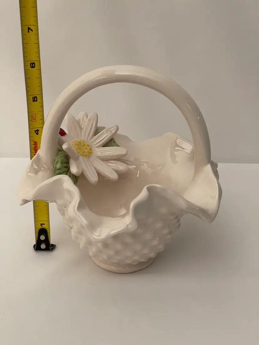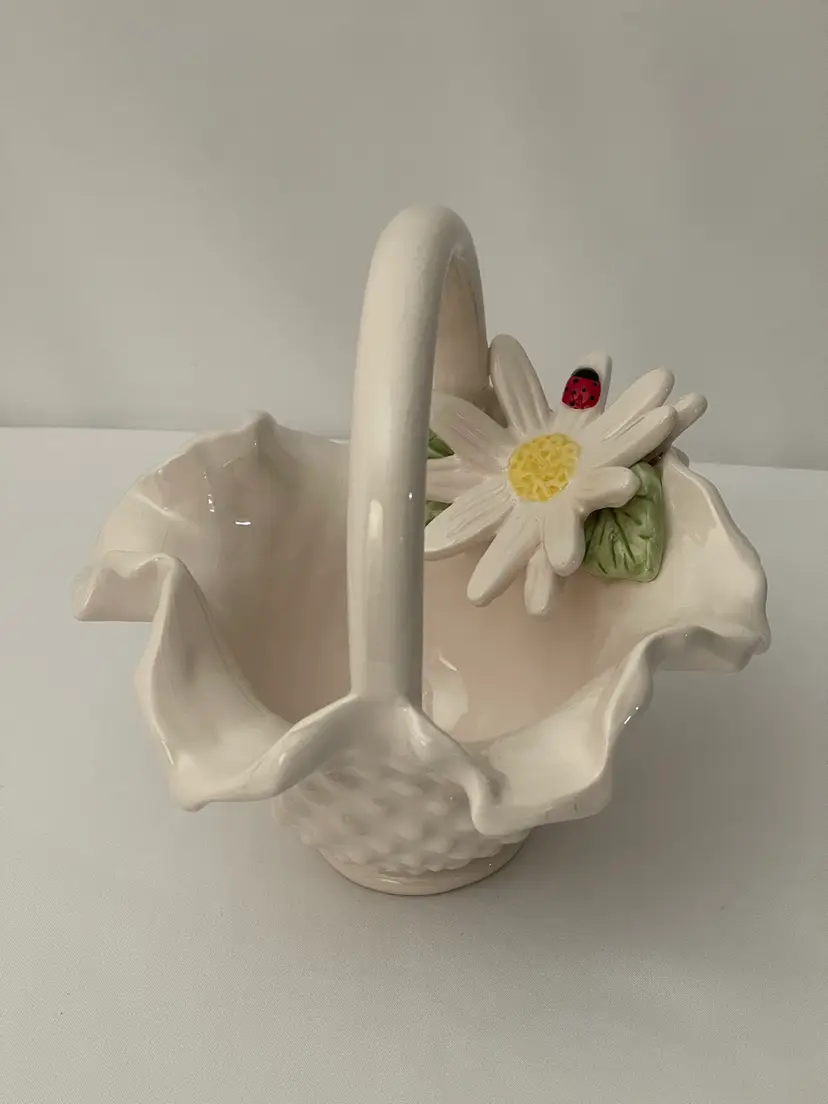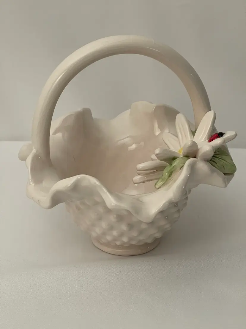 White Hobnail Ruffled Ceramic Vase with White Flower and Ladybug Basket. No chips