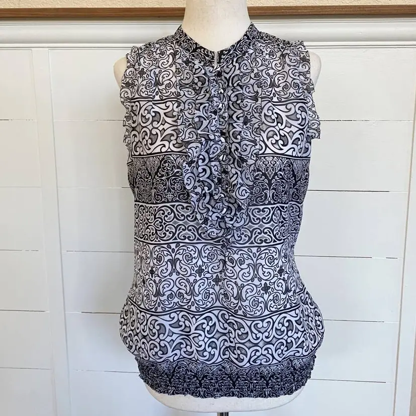 White House Black Market Ruffle Button Up Tank Sleeveless Abstract Print ~ Elastic Hem ~ 1/2 Button Ruffle Front White, black and gray Sheer print pattern over lined bodice, all material made of 100% polyester. Perfect for the work week!