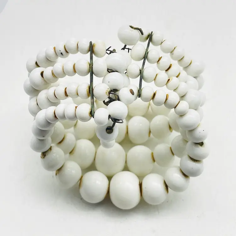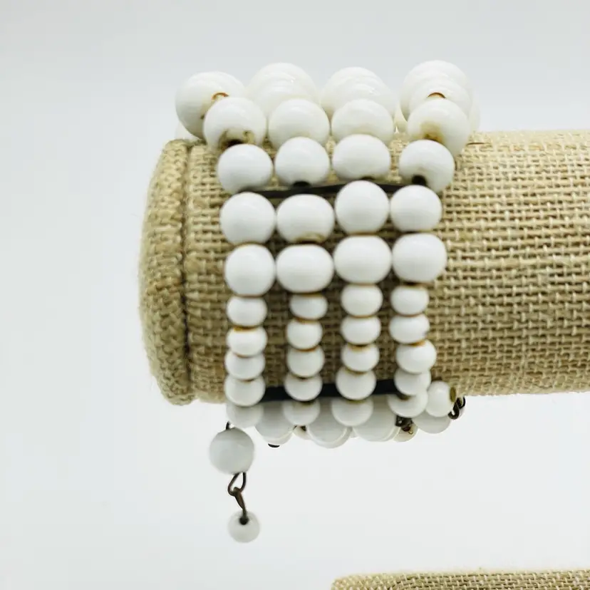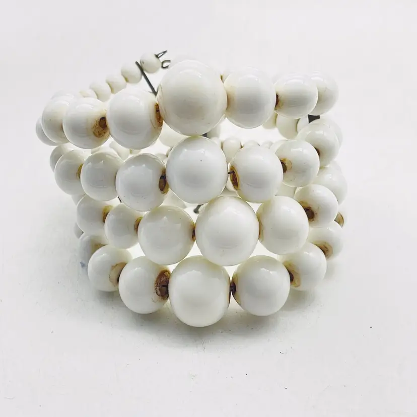 Beautiful four-row cuff bracelet featuring smooth white milk glass beads on stretch cords for a comfortable fit. Features: Four-row cuff-style stretch bracelet Genuine milk glass beads Smooth round bead design Flexible and easy to wear Classic vintage look milk glass cuff bracelet, white beaded bracelet, stretch cuff bracelet, vintage style jewelry, four row bracelet, retro costume jewelry, classic white bracelet, milk glass beads, statement bracelet