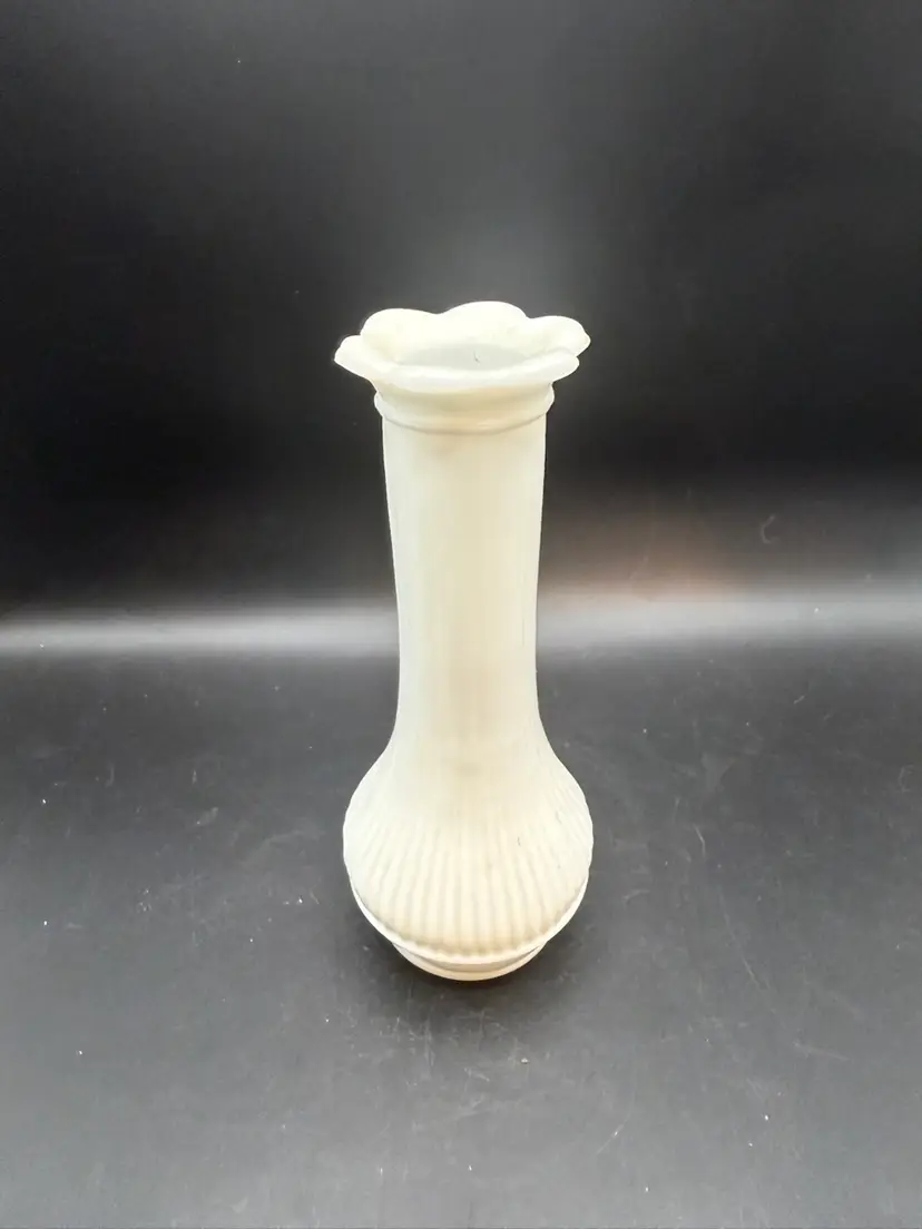 This particular vase, with its fluted base and scalloped rim, is characteristic of decorative glassware produced in the mid-20th century.
