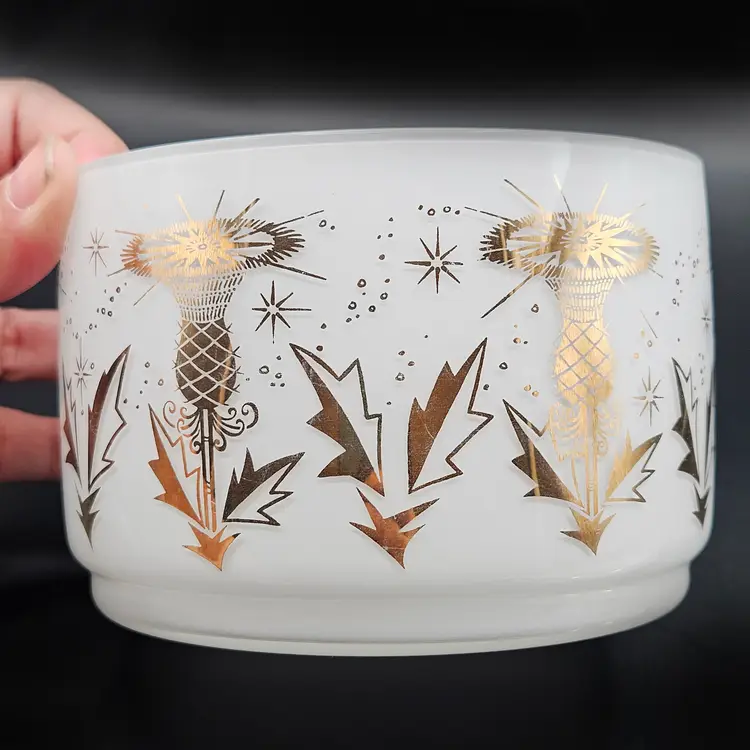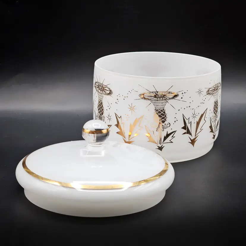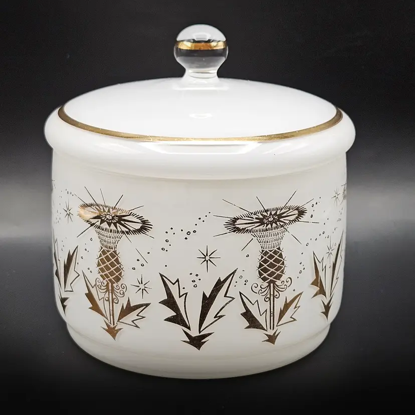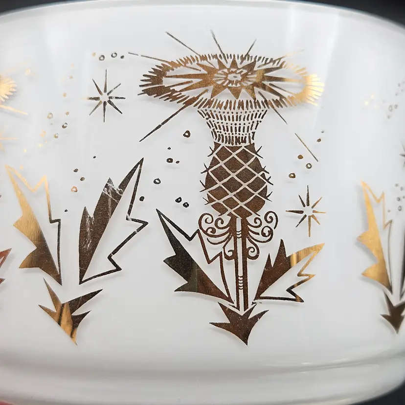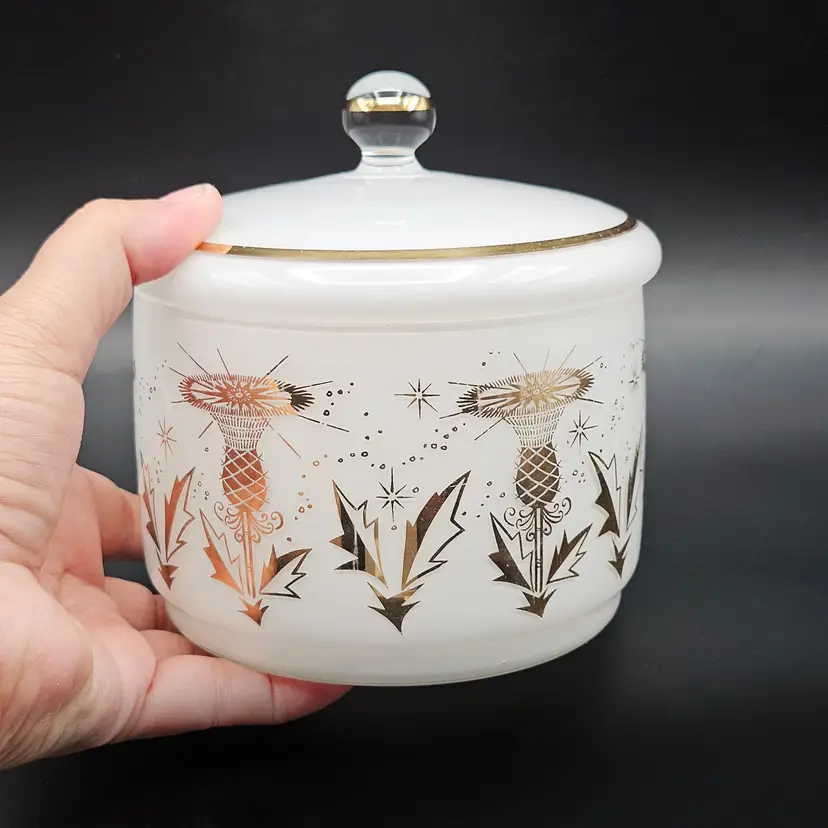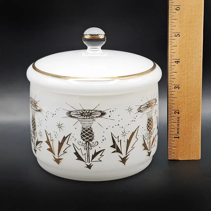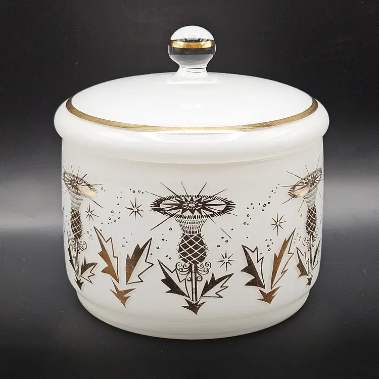 Vintage mid-century modern (MCM) white milk glass lidded jar or bowl featuring gold "Atomic Starburst" or "Thistle" design. Era likely late 1950s or 1960s. The image features a stylized Scottish thistle, a common botanical illustration and national symbol of Scotland. The thistle is the national flower of Scotland, symbolizing resilience, protection, and heritage.