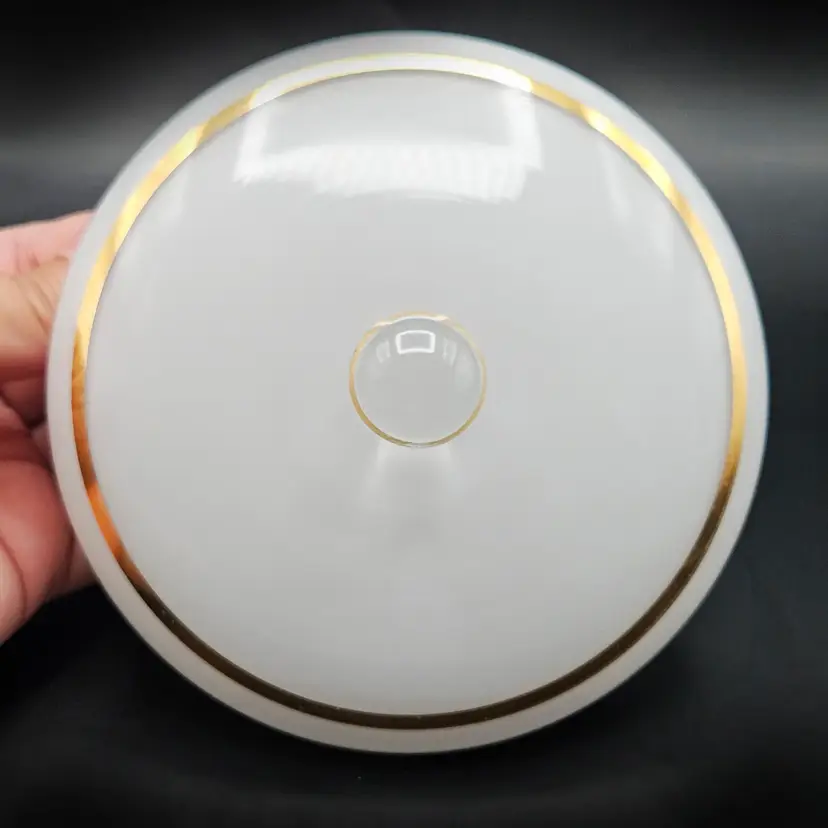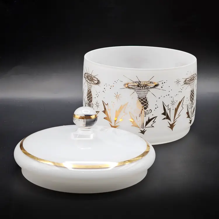 White Milk Glass Lidded Jar or Bowl Gold Atomic Starburst Thistle Design Vintage Mid-century Modern (MCM)