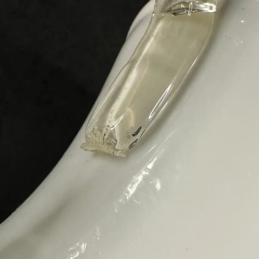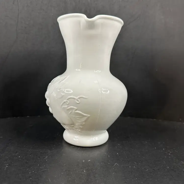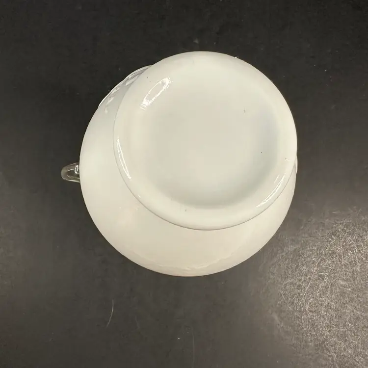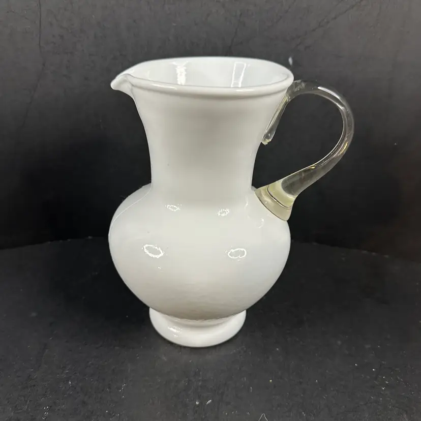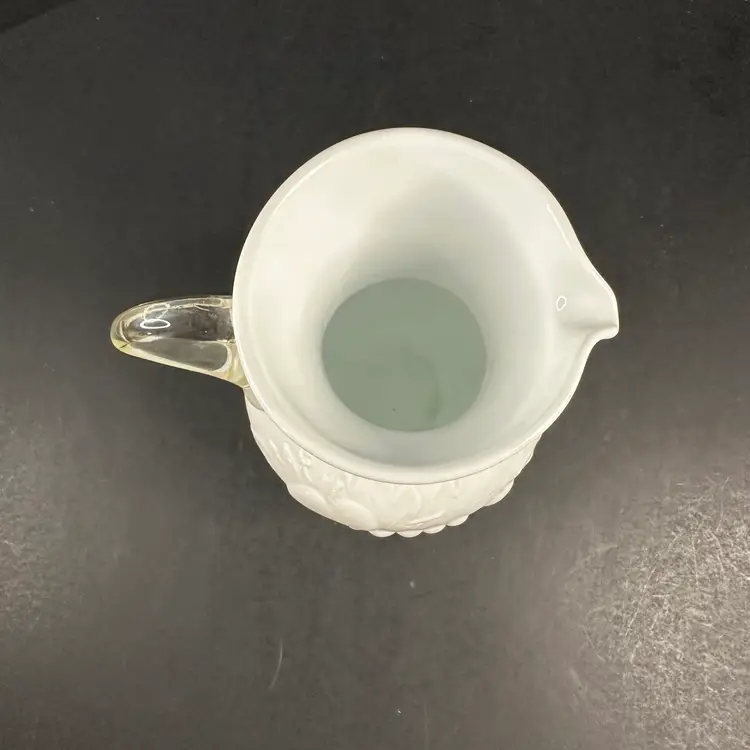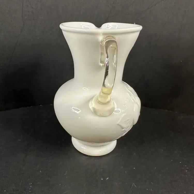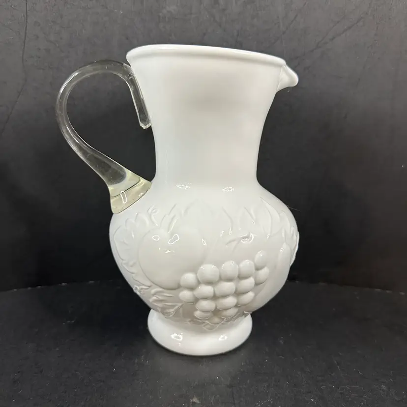 White Milk Glass Pitcher with Clear Applied Handle Embossed Fruit, Grape, Leaf in good preowned condition. This pitcher measures approximately 6.5 x 5.5 x 7.75 inches. No chips, nicks or cracks but the end of the applied handle is rough. Please see photos for all the details.