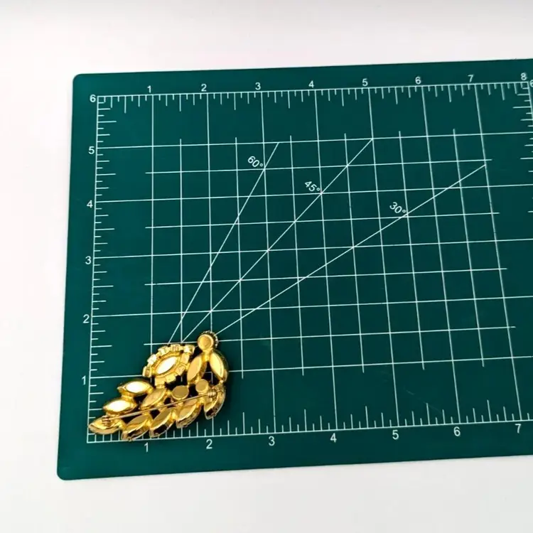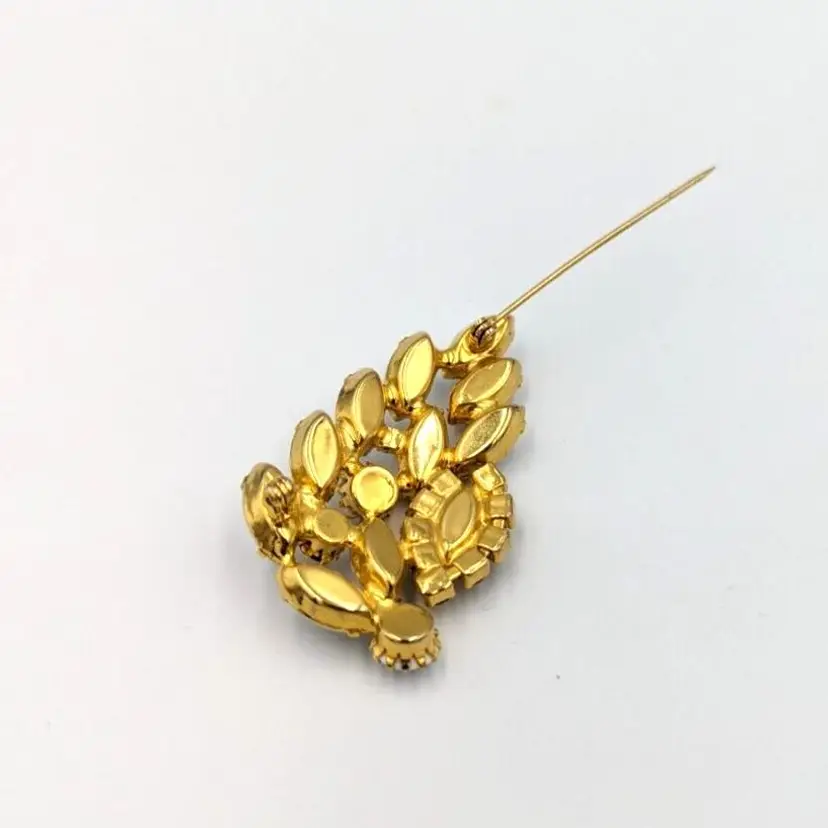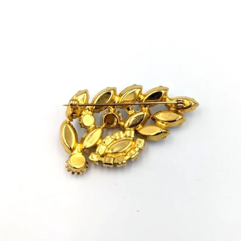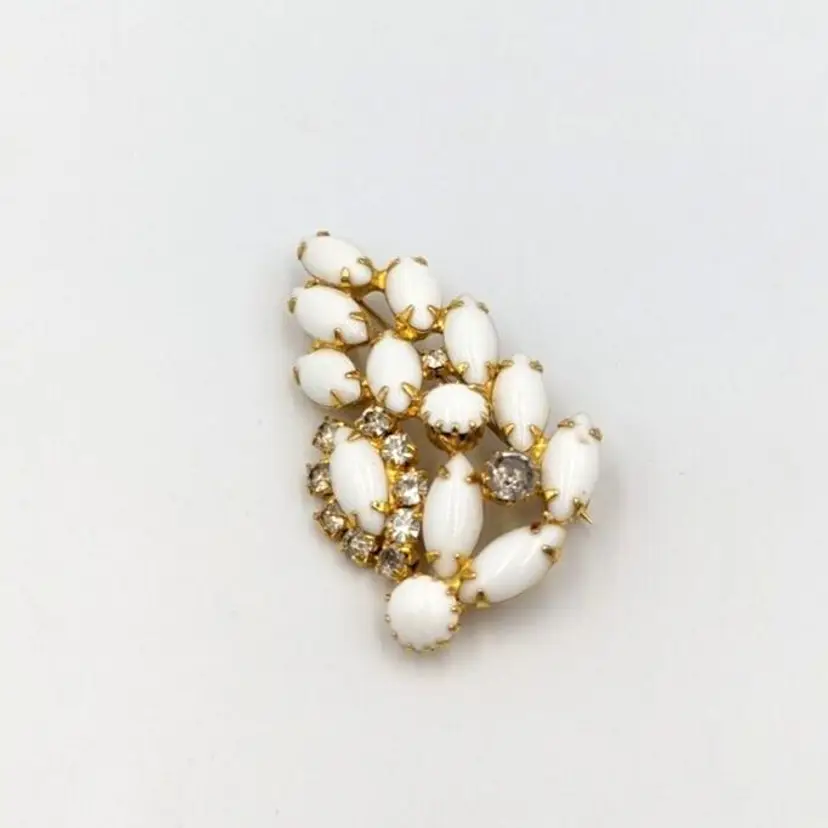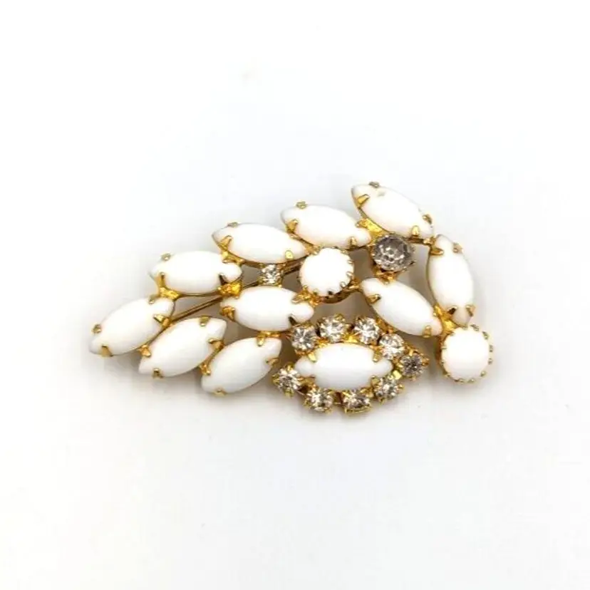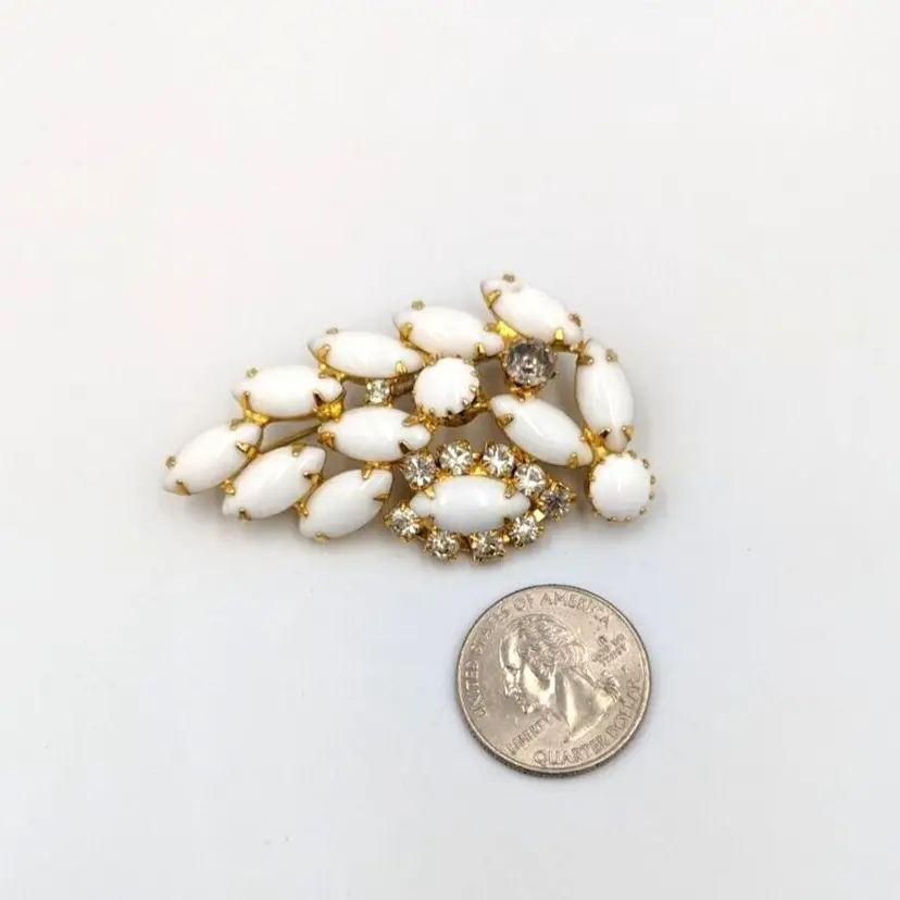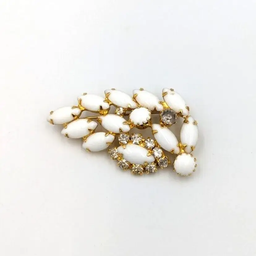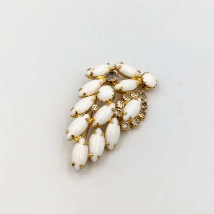 White Navette Milk Glass Rhinestones Brooch Gold Tone Vintage Unmarked Pin Measurements 2.25" x 1.5" unmarked Good vintage condition