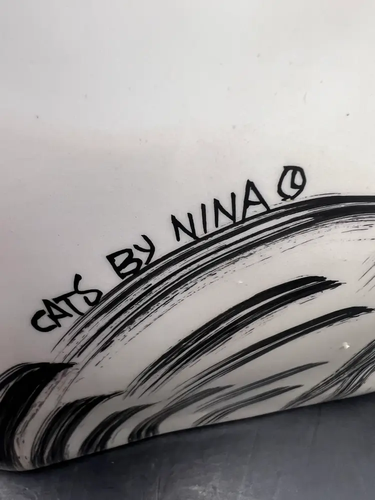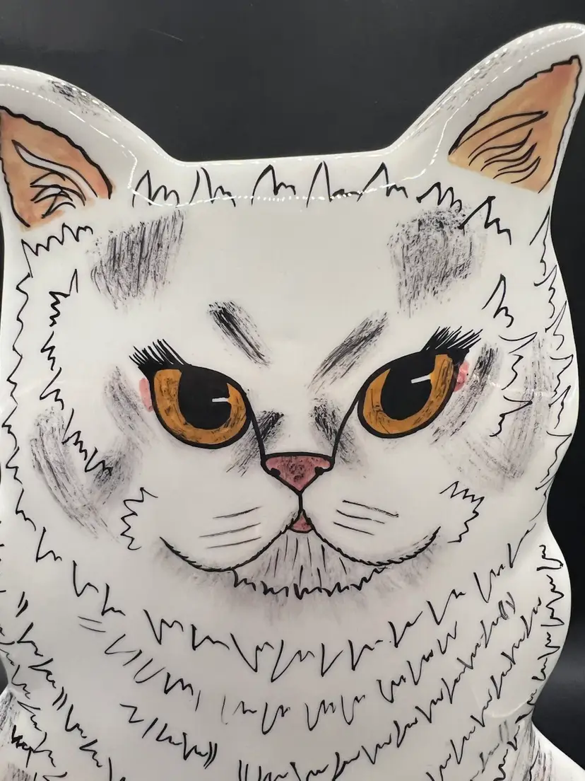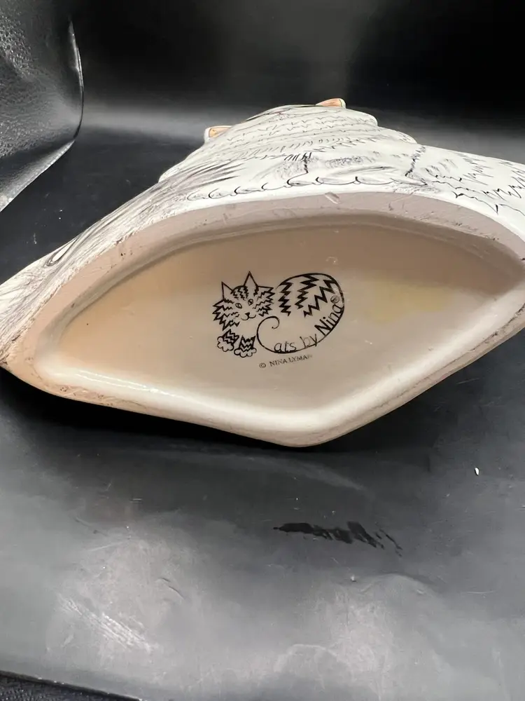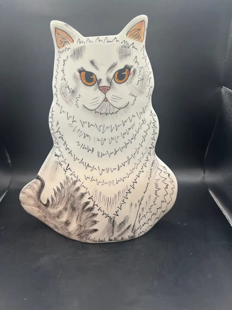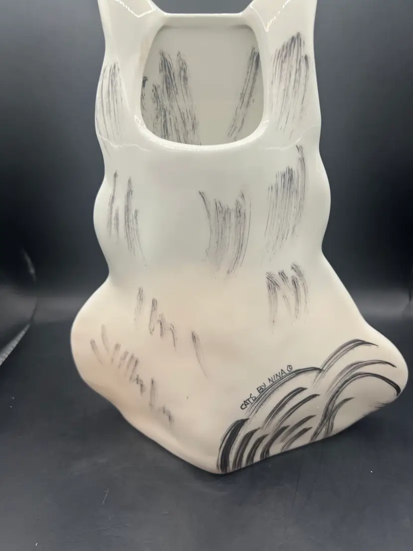 White oersian cat vase “Cats by Nina” ceramic vase whit with black hand painted 11” tall 9 1/2” wide on the bottom and 5” wide on top no damage pre owned