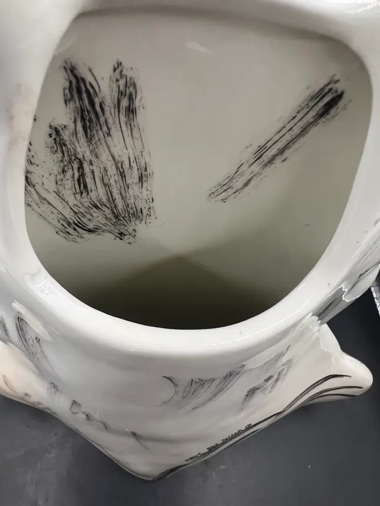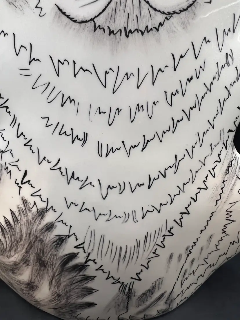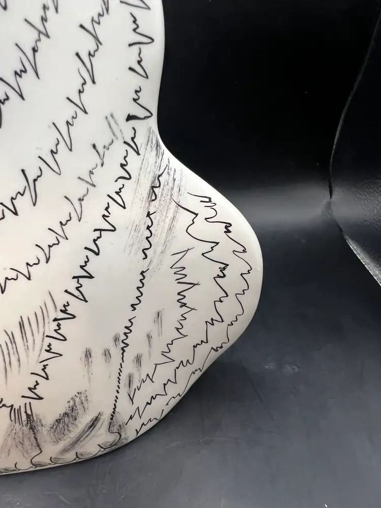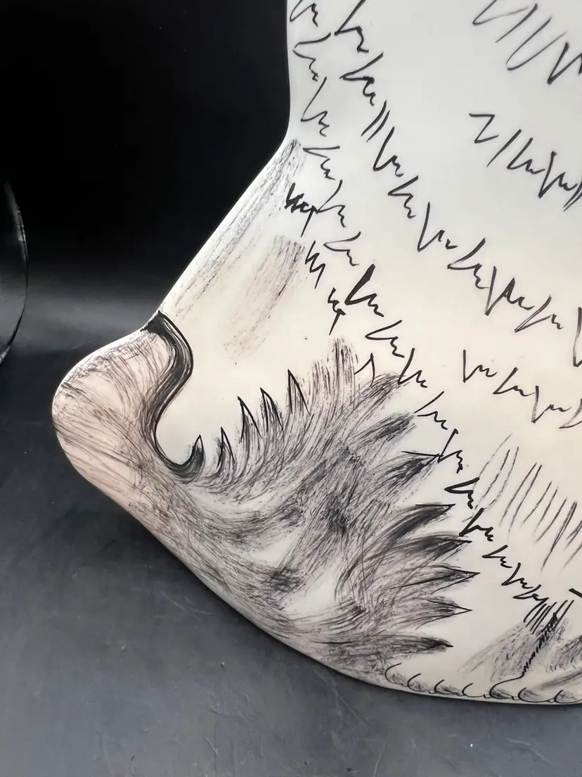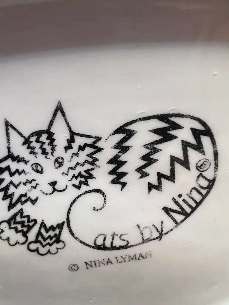 White oersian cat vase “Cats by Nina” ceramic vase whit with black hand painted 11” tall 9 1/2” wide on the bottom and 5” wide on top no damage pre owned