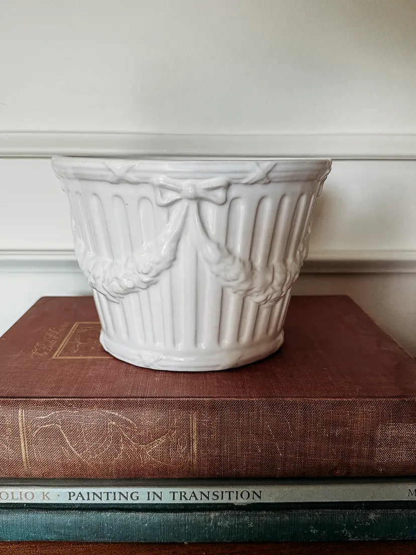 This planter pot has so much lovely detail! Garlands or boughs swoop from one ribbon to the next at the rim. There are also small X's at the top and bottom and a raised stripe pattern the entire way around the planter. Can use all year round, but these piece reminds me of the holidays and looks GORGEOUS filled with evergreens, a poinsettia, or a Christmas cactus!