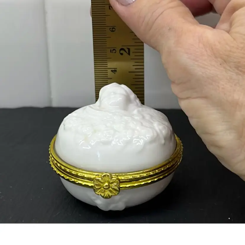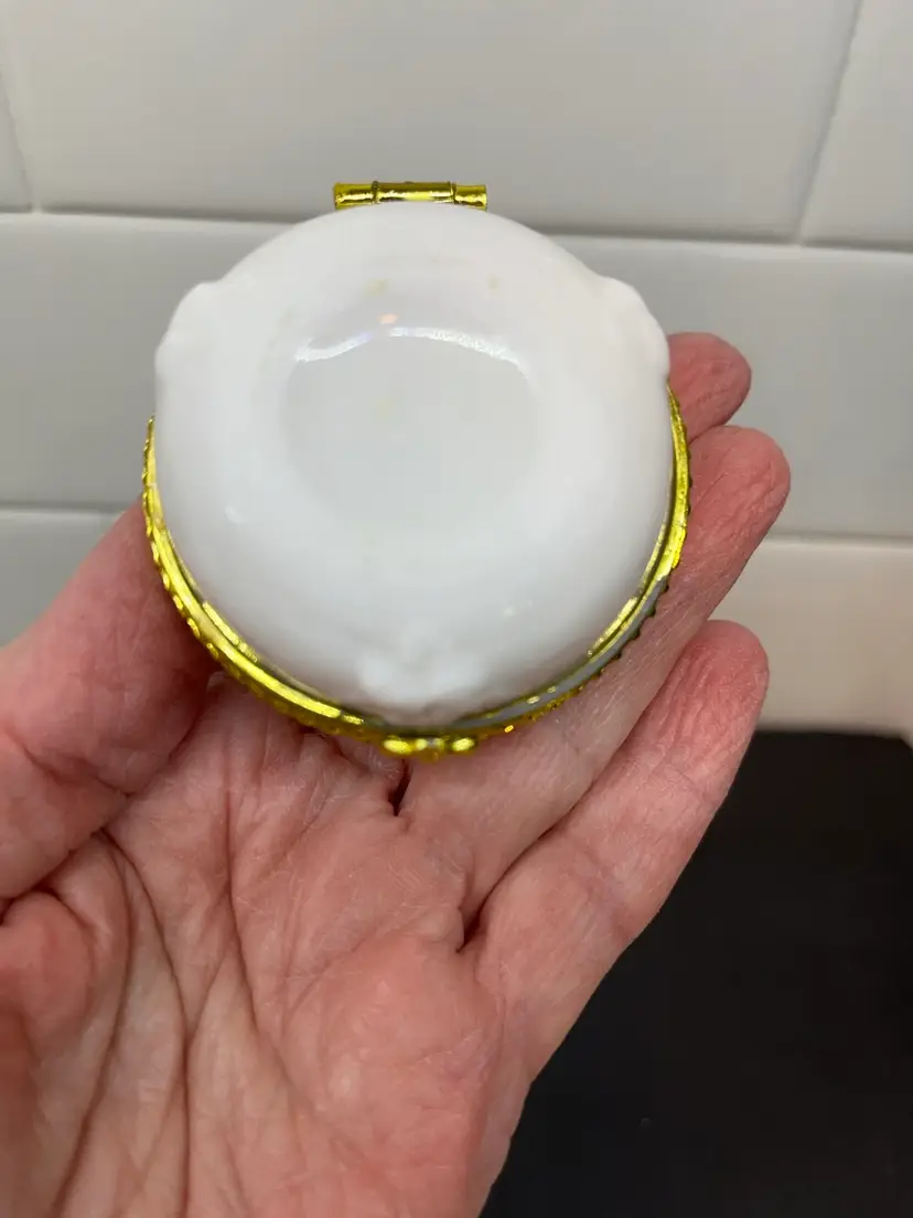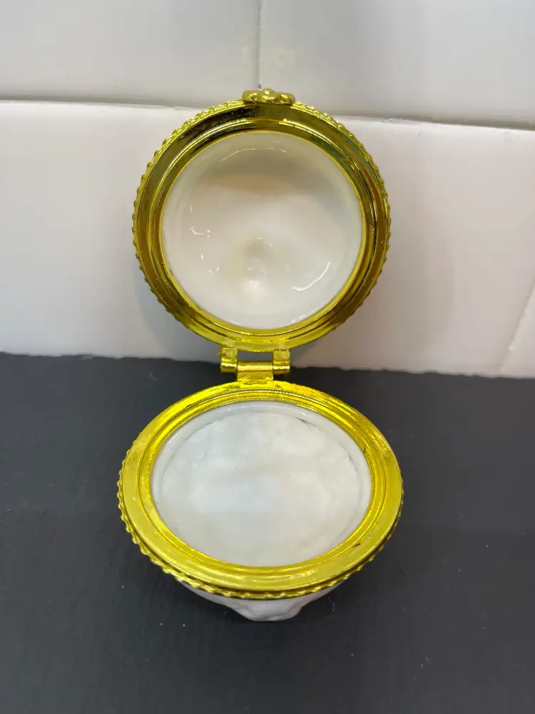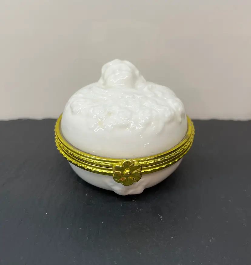 Round, white porcelain trinket box with hinged lid, cherub on top. Perfect for engagement ring!!!