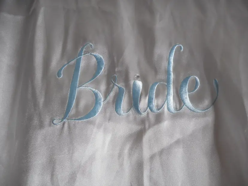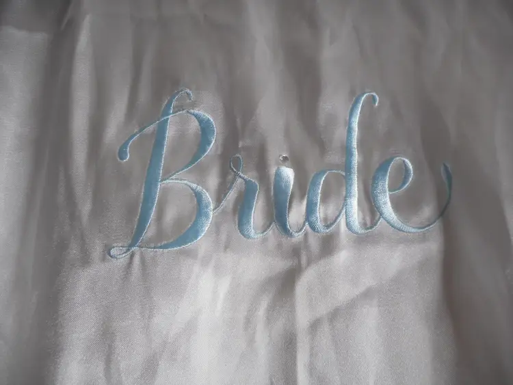 Blue bride embroidered on back with rhinestone dotting i