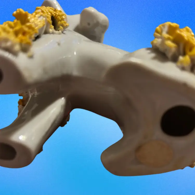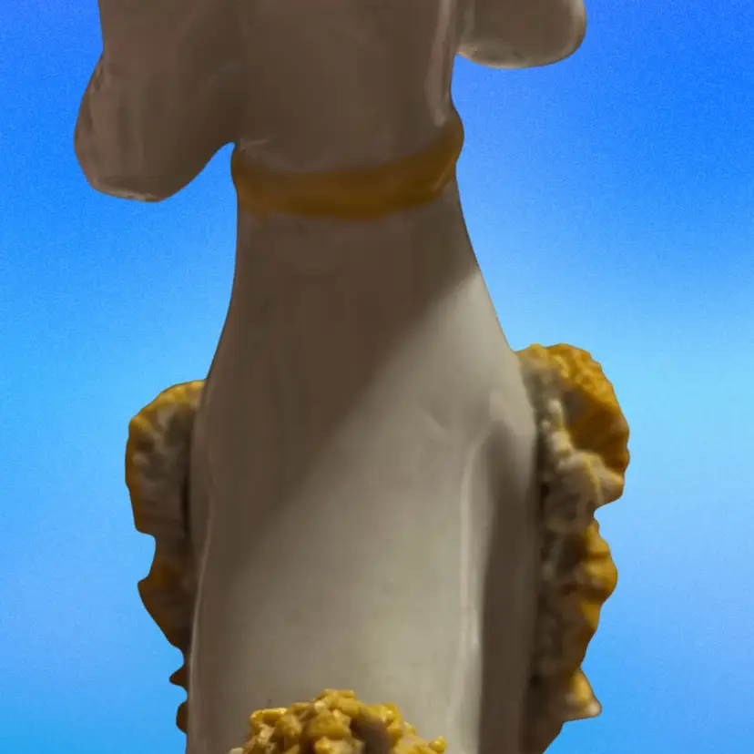 This is a vintage white porcelain spaghetti poodle figurine with yellow accents.