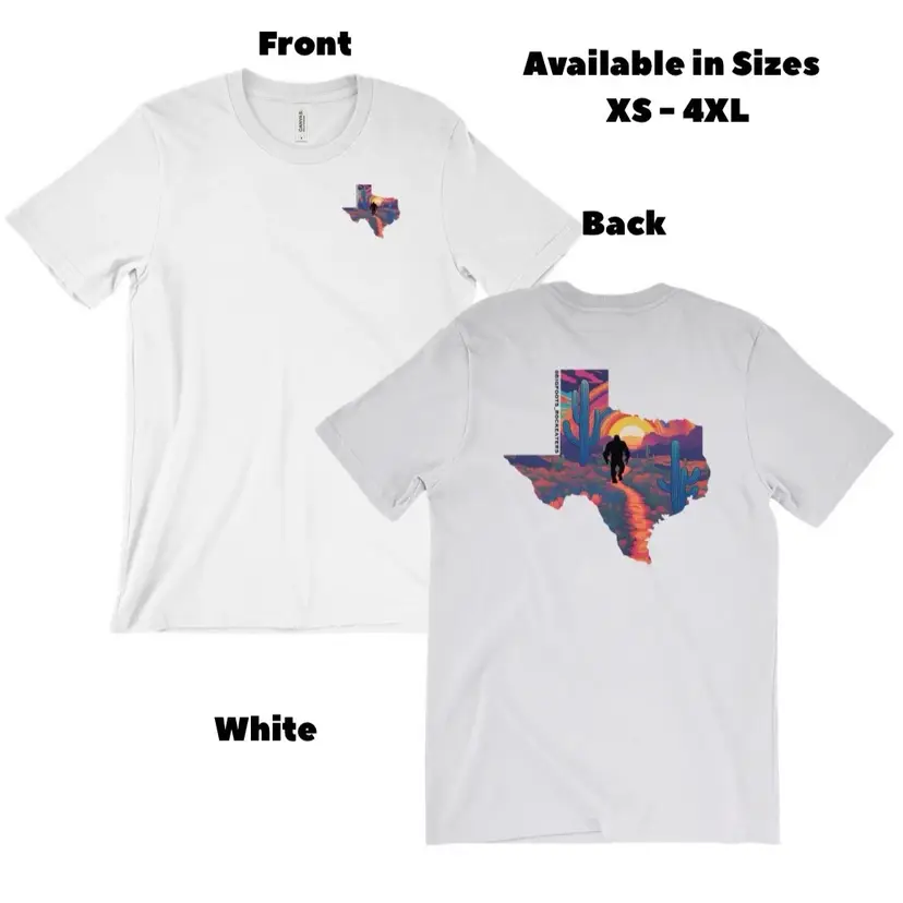 🌵 On the front, a minimalist Texas outline is filled with vibrant desert hues, a cactus bloom, and our signature Bigfoot vibe. 🌞 On the back, Bigfoot wanders through a psychedelic Texas sunset, framed by surreal saguaro and a painted sky – a visual ode to the beauty and mystery of the Lone Star state.