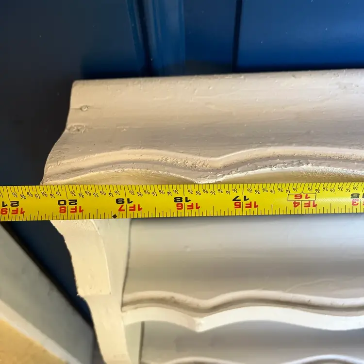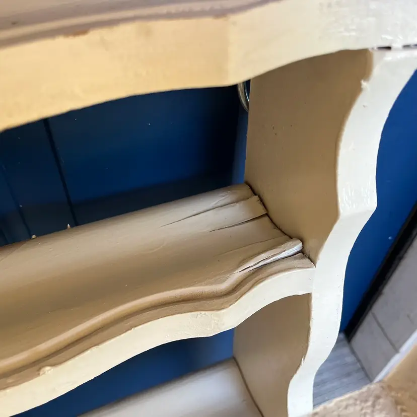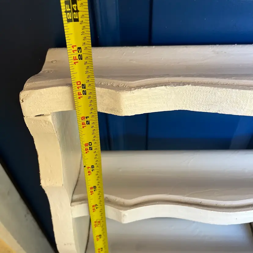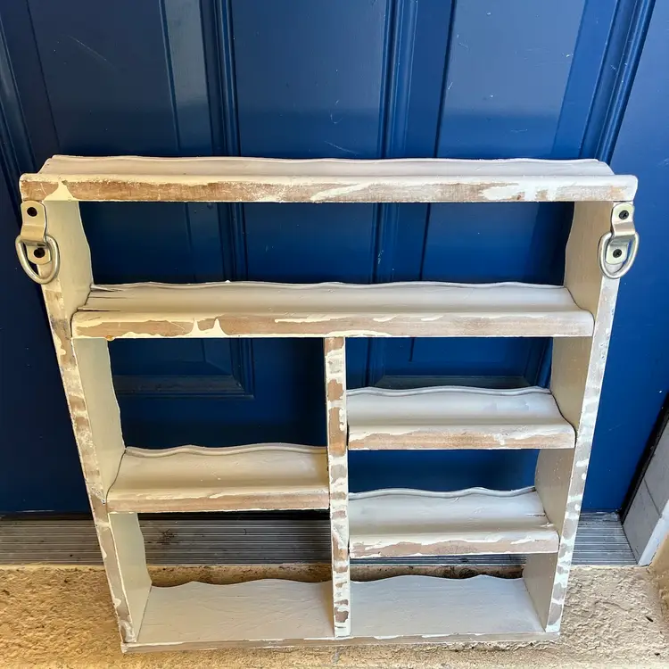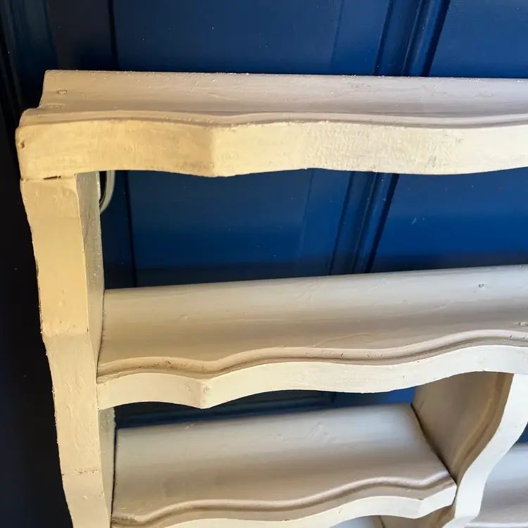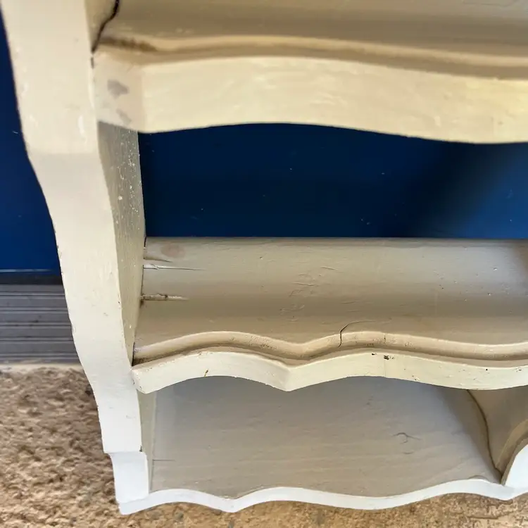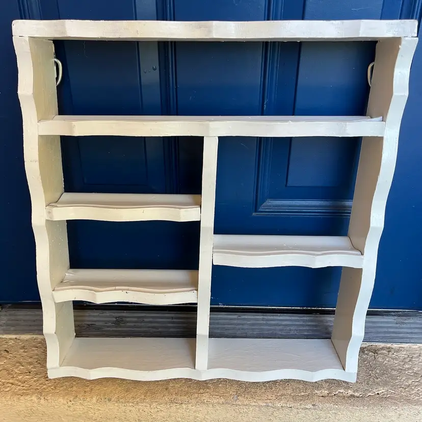 This is an adorable wood trinket shelf with scalloped edges. It has some splitting due to how it was made but is very solid and adorable! It can hang or set on a shelf. 22 1/4” tall 21 1/2” wide