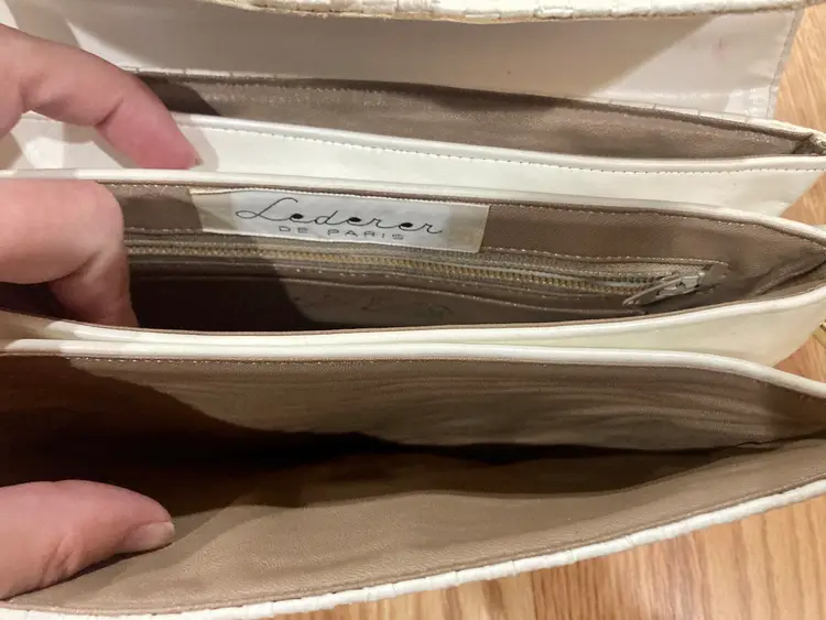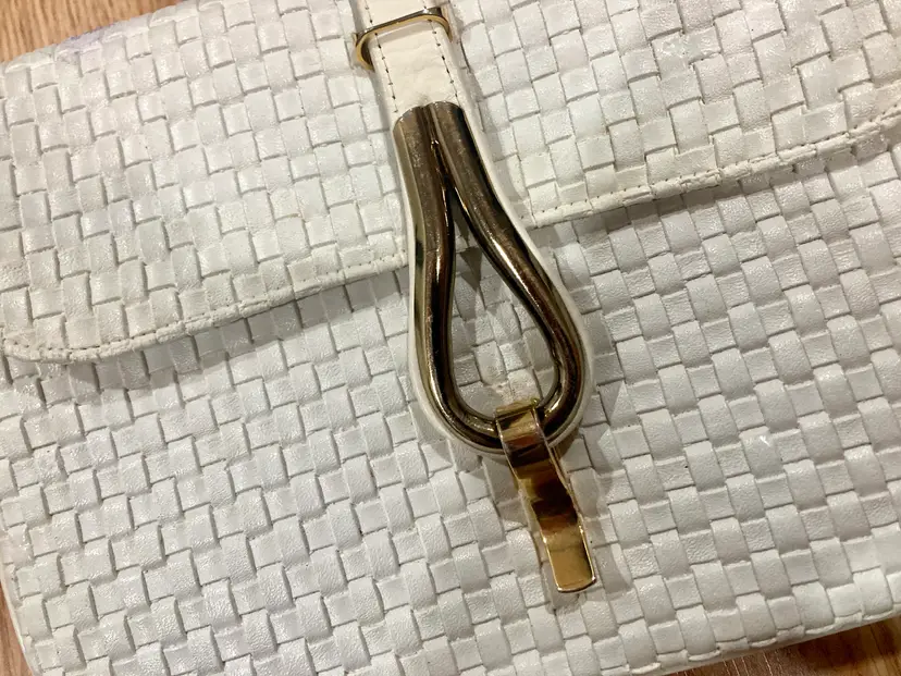 vintage white leather purse. woven. incredible gold tone hardware closure. multiple pockets. adjustable strap.