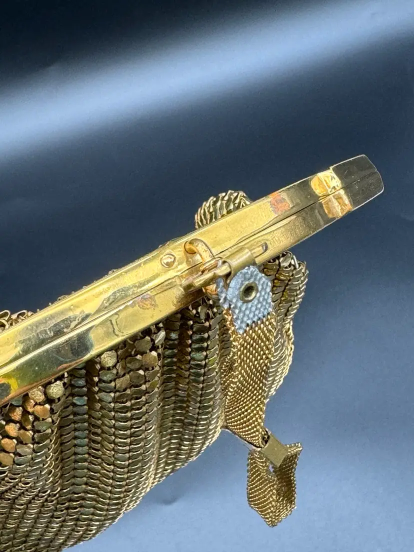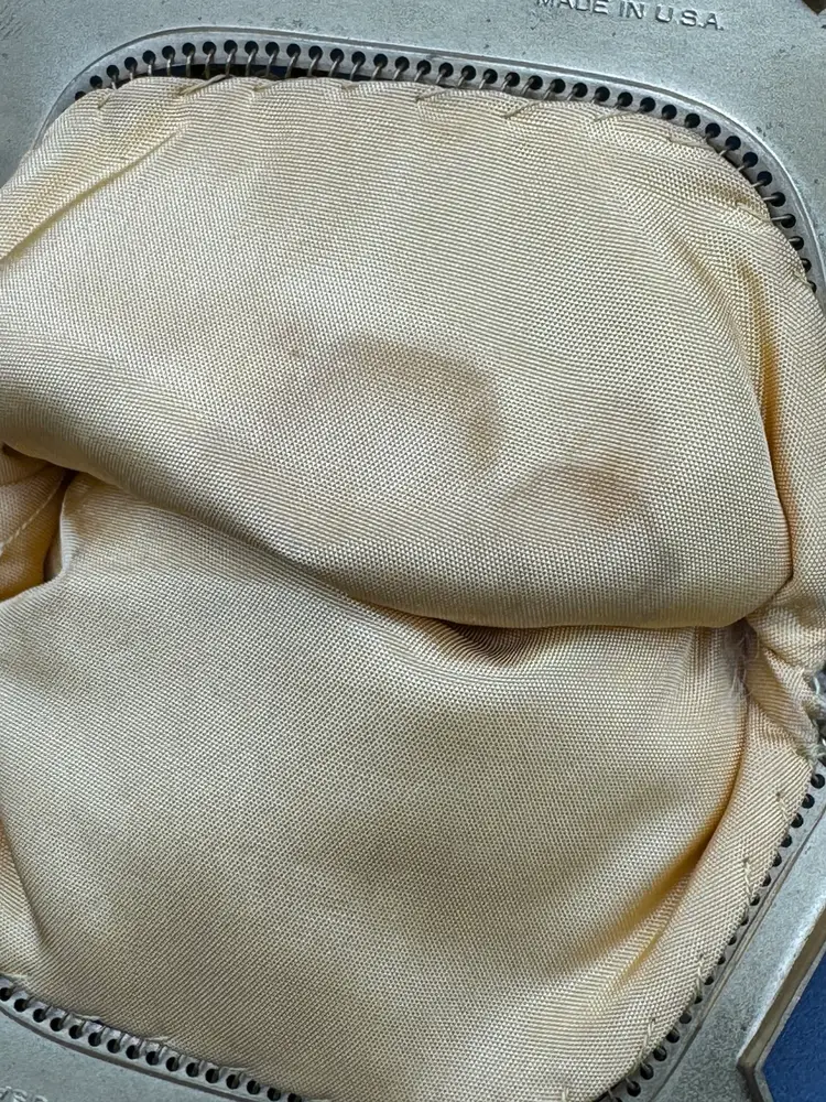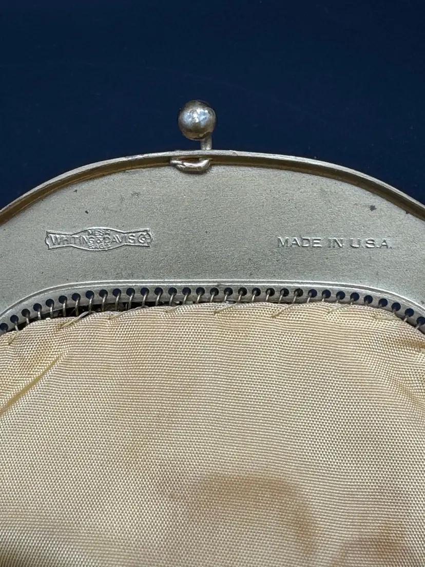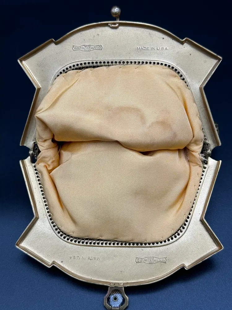 6x5" from top of strap to bottoms and across. Clasp works, signed on the inside Small stain on the inside.