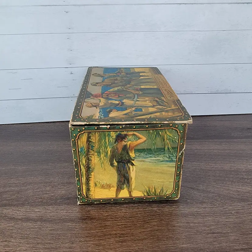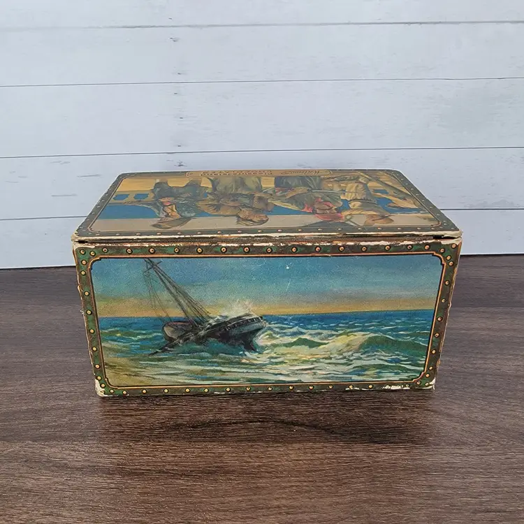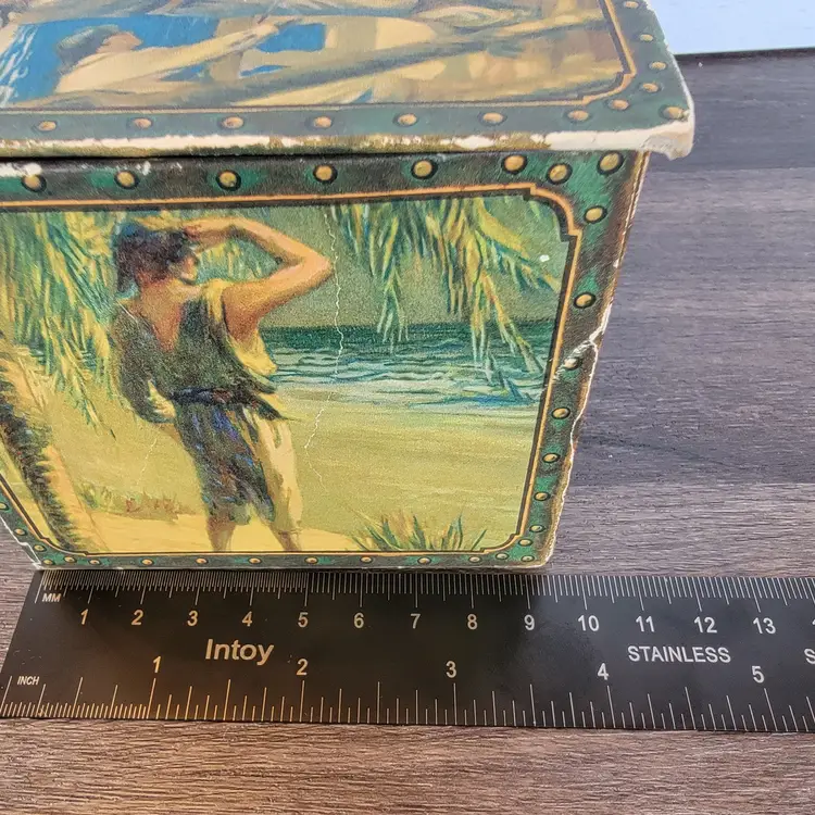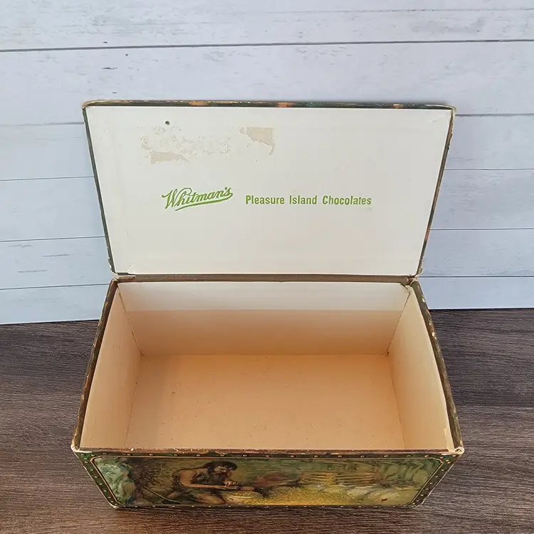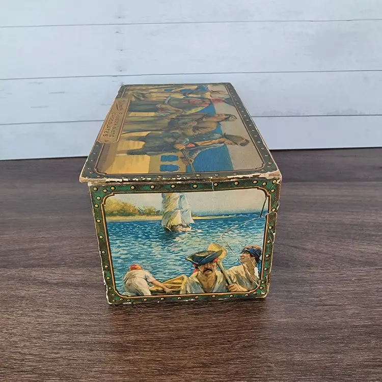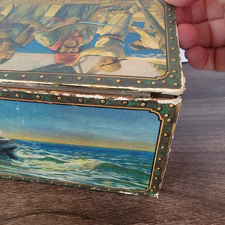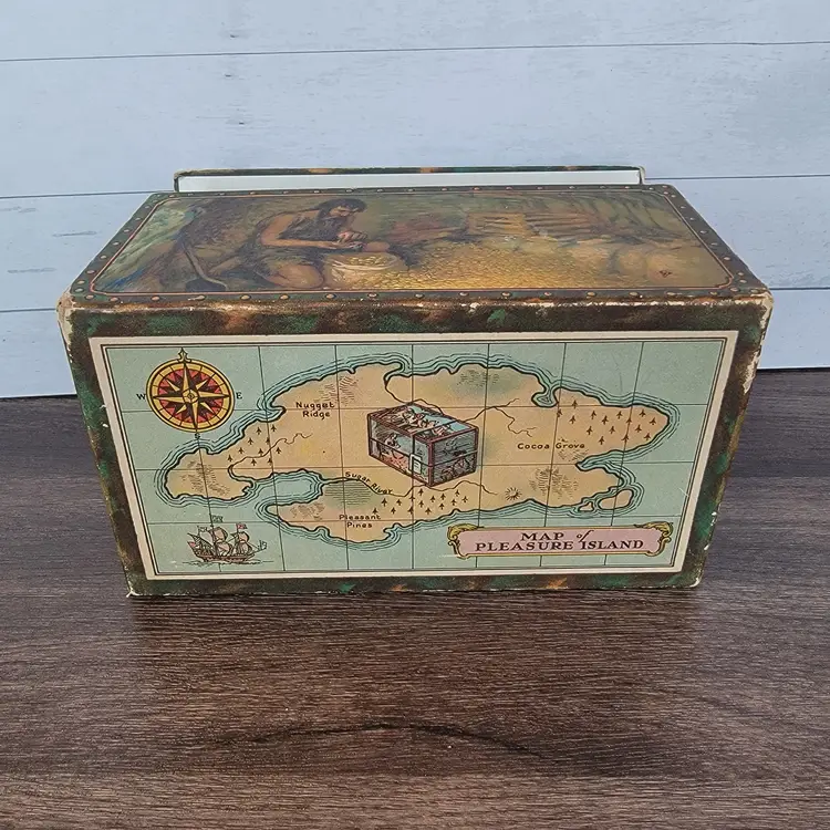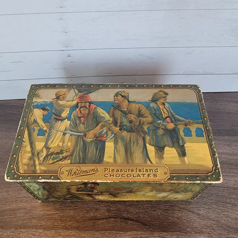 • Vintage chocolate storage box • Nautical pirate-themed artwork • Decorative riveted border design • Multiple scenic illustrations • Whitman's Pleasure Island branding
