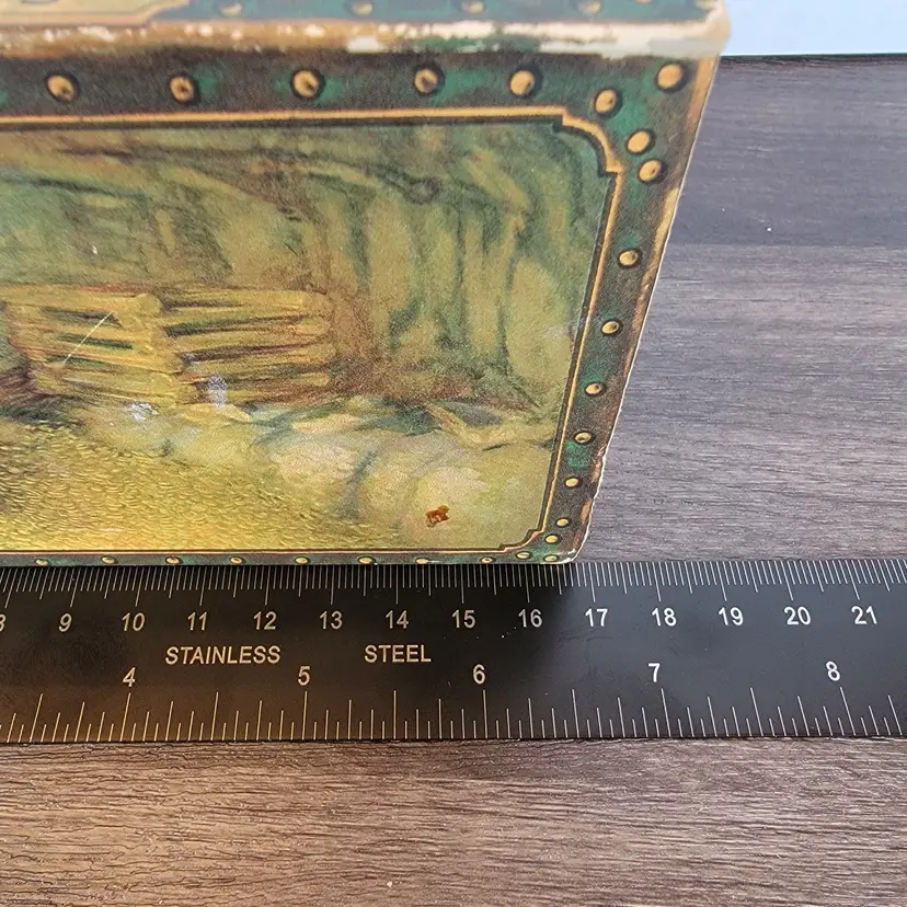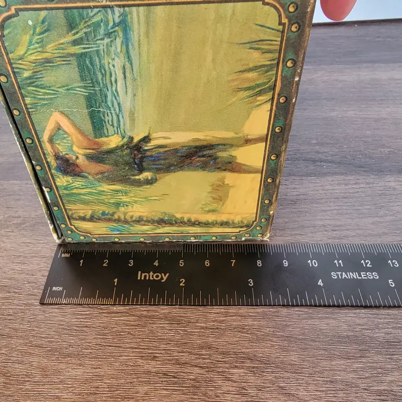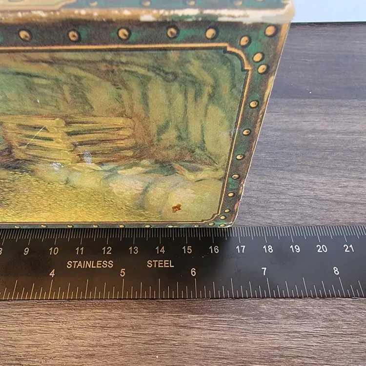Measurements approximately: 6.5" long; 3.5" wide; 3.25" tall Condition: pre-owned; Minor edge wear consistent with age and handling. Some slight discoloration and chipping along borders. The lid is not detached; see photos