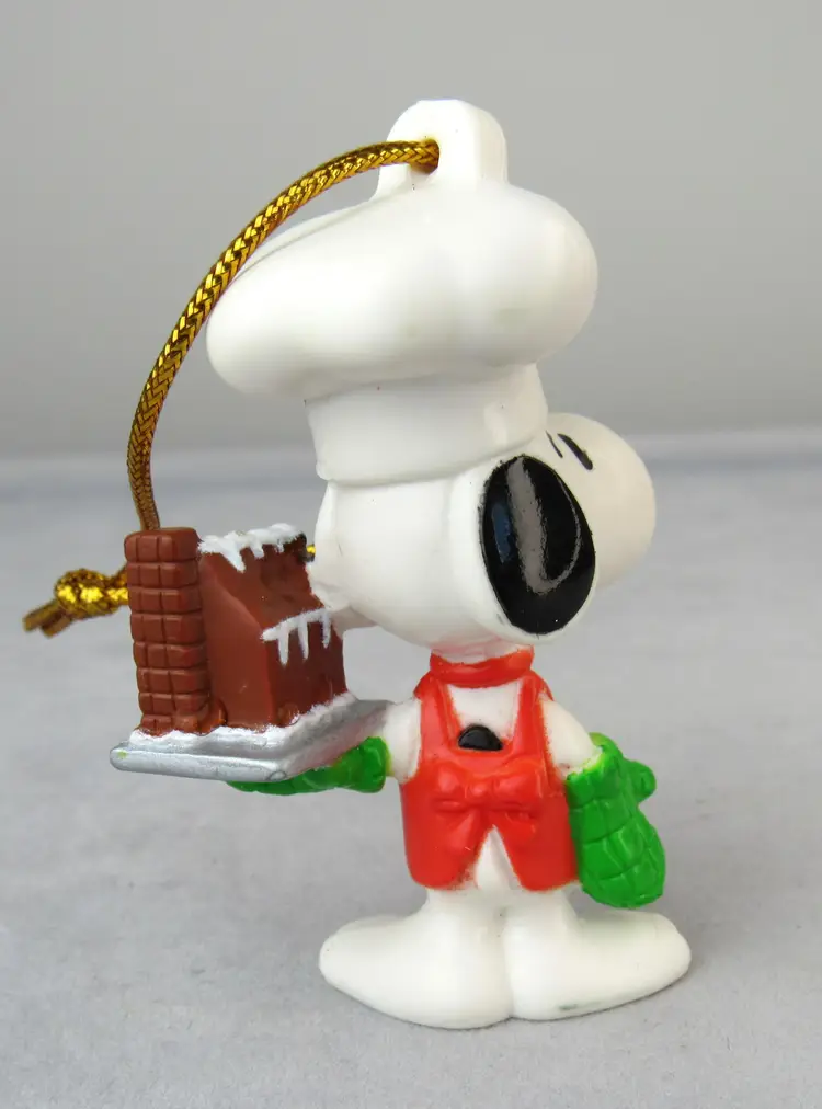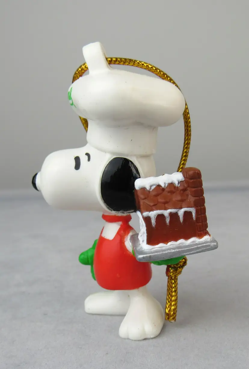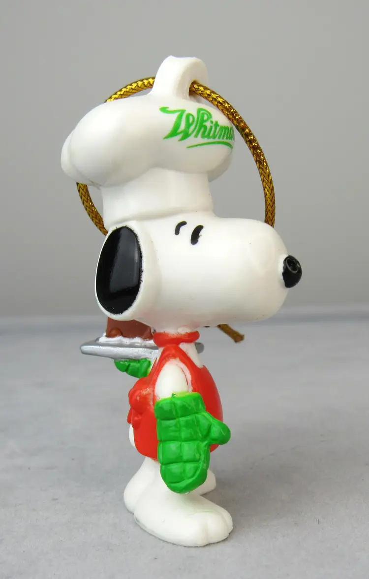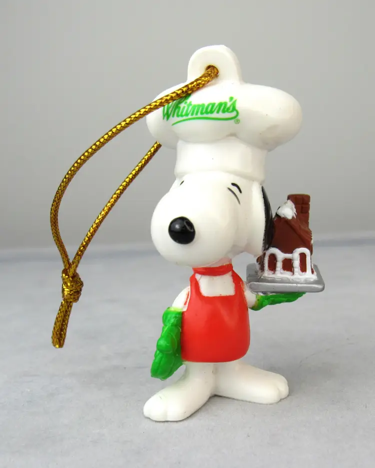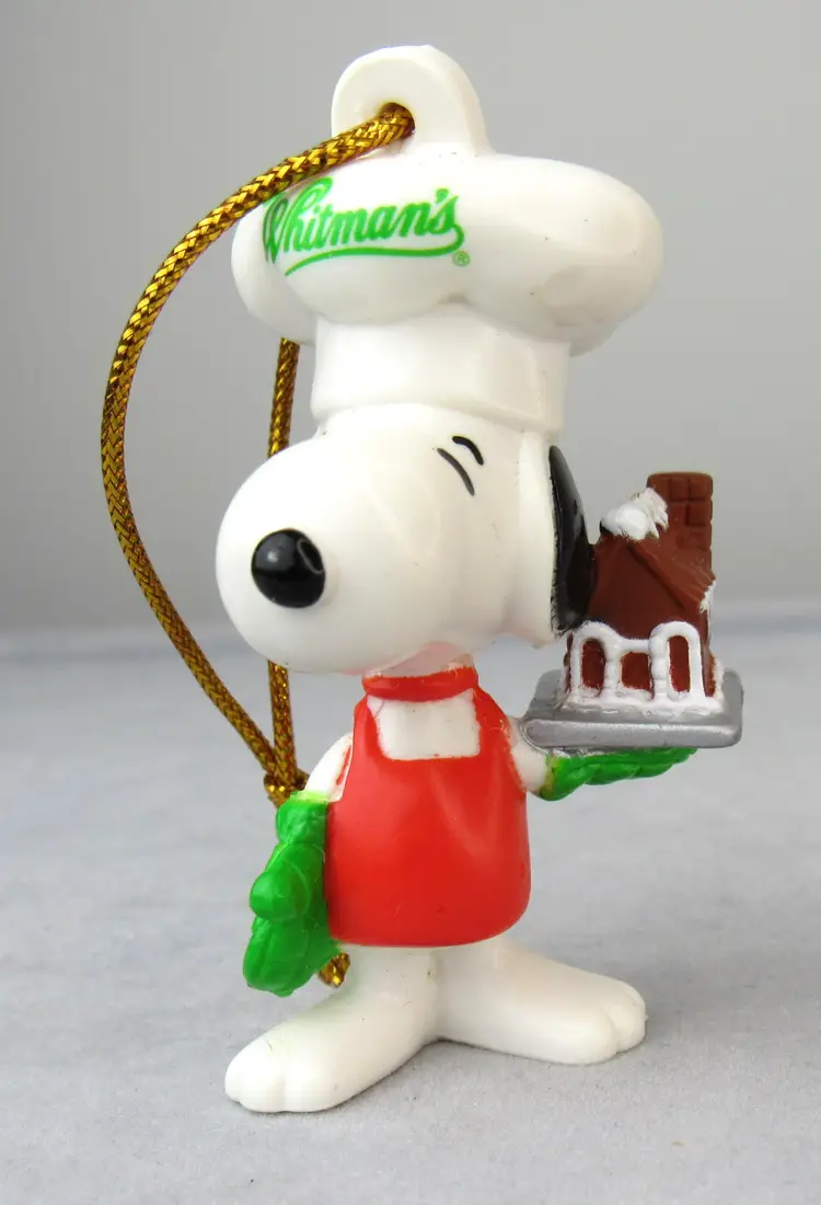 Excellent used condition. Chef Snoopy in a Whitman's chef hat holding a Gingerbread house. Measures 2.5" tall x 1.5" wide. Has a gold string for hanging.