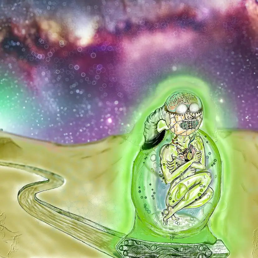 Suspended in a glowing green womb-like pod, an alien humanoid figure curls into a fetal position—half biological, half cybernetic. Its translucent skin reveals wires, bones, and luminous orbs beneath the surface, while its face is a haunting fusion of nervous system and technology. With its mouth clamped and eyes wide behind glassy goggles, it appears both aware and entrapped.
