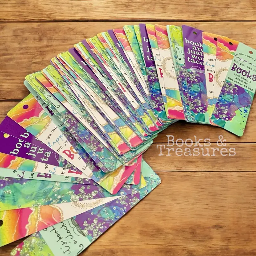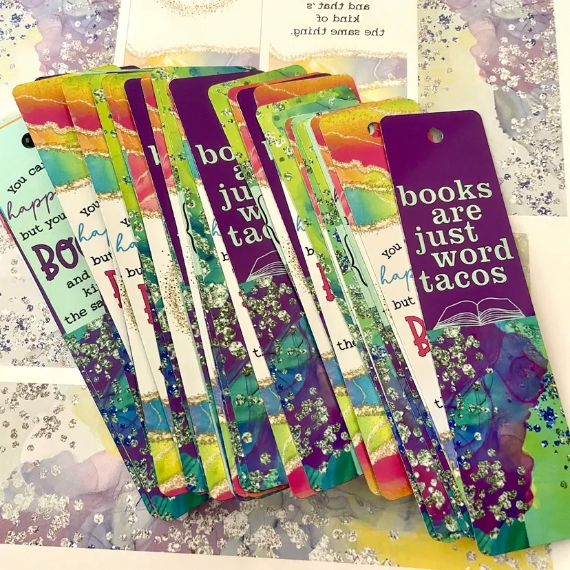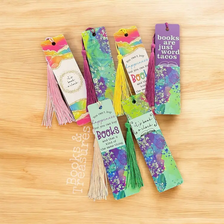 These bookmarks are a mix of bookish sayings and bright designs with a brushed metal back.
