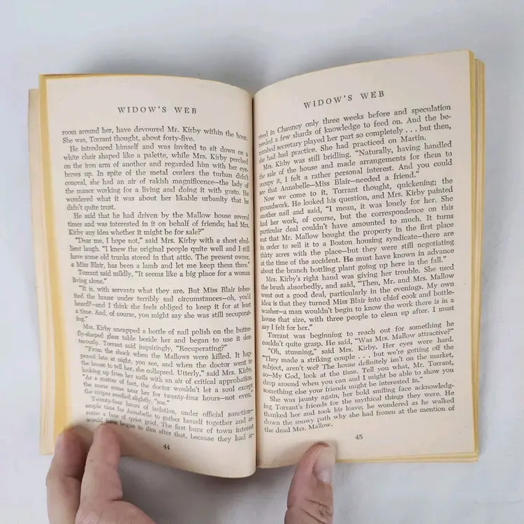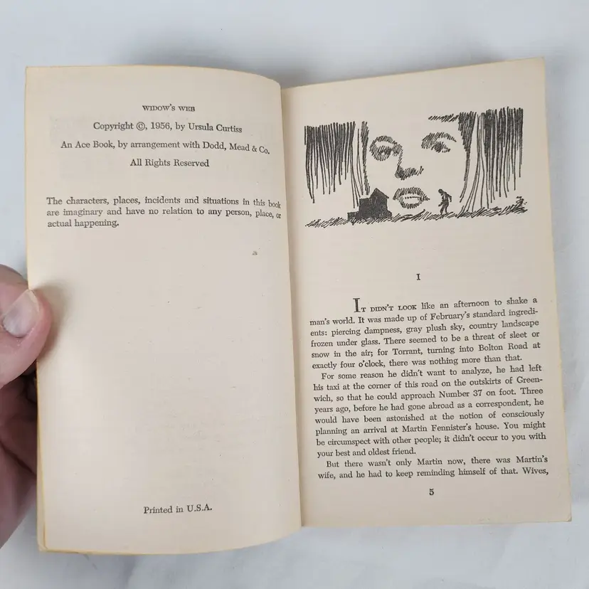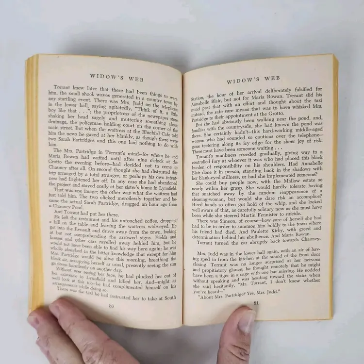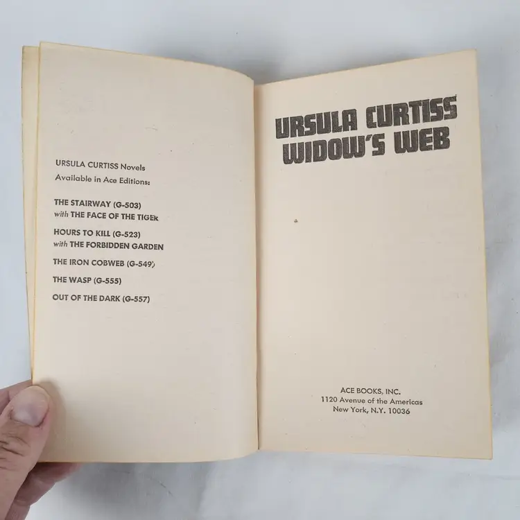 Book Title: Widow's Web Narrative Type: Fiction Publisher: Ace Books Original Language: English Publication Year: 1956 Type: Novel Format: Paperback Language: English Author: Ursula Curtiss Genre: Crime & Thriller, Mystery Topic: Crime, Suspense Country/Region of Manufacture: United States