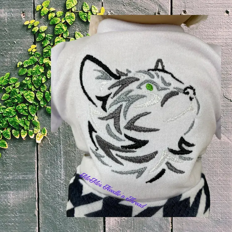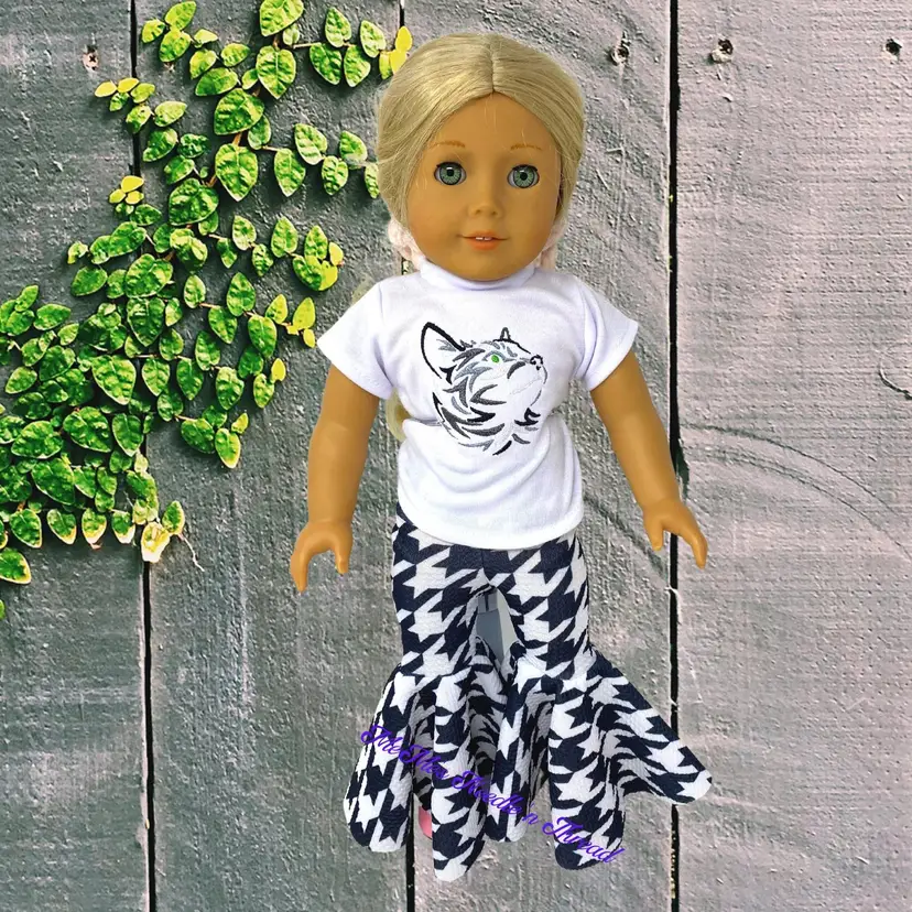 Unleash your 18" doll's wild side with this fierce embroidered cat tee and houndstooth bell bottoms. Perfect for adding a touch of adventure to your doll's wardrobe! Bell bottoms are made of bullet knit fabric. 100% cotton shirt with cat embroidery design. This is not a patch.