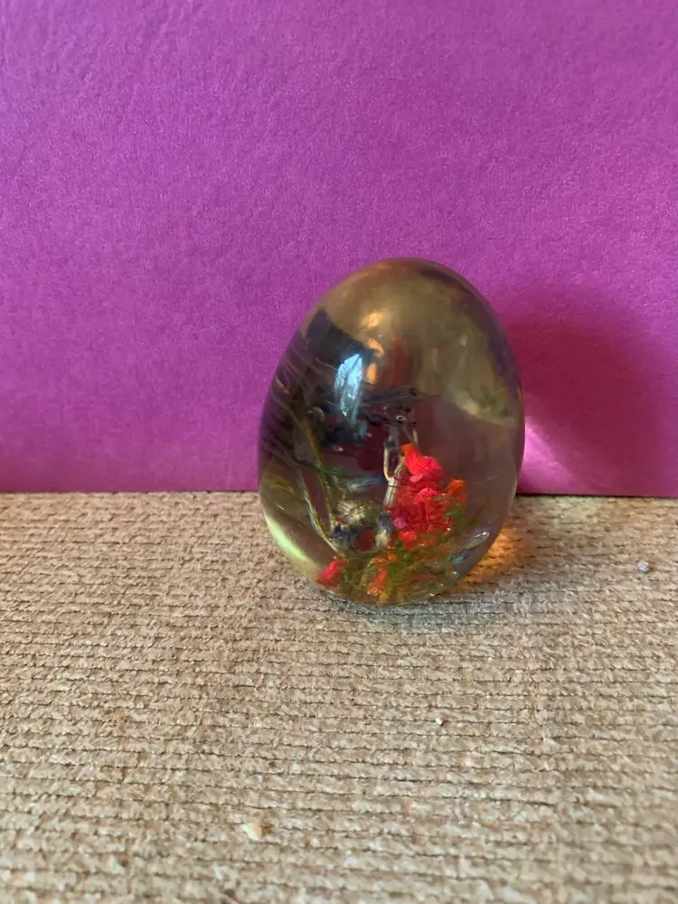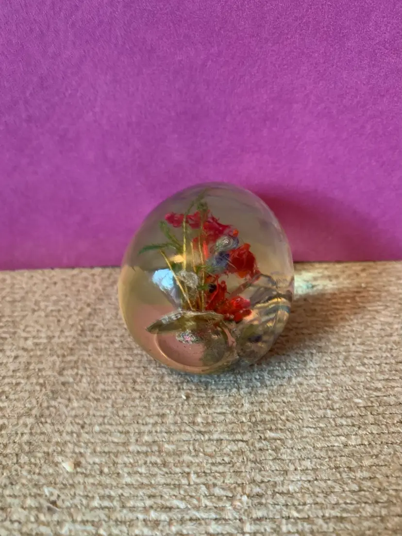 Umarked. There is a crack at the bottom and scratches on the paperweight. 2 x 2 1/2 inches