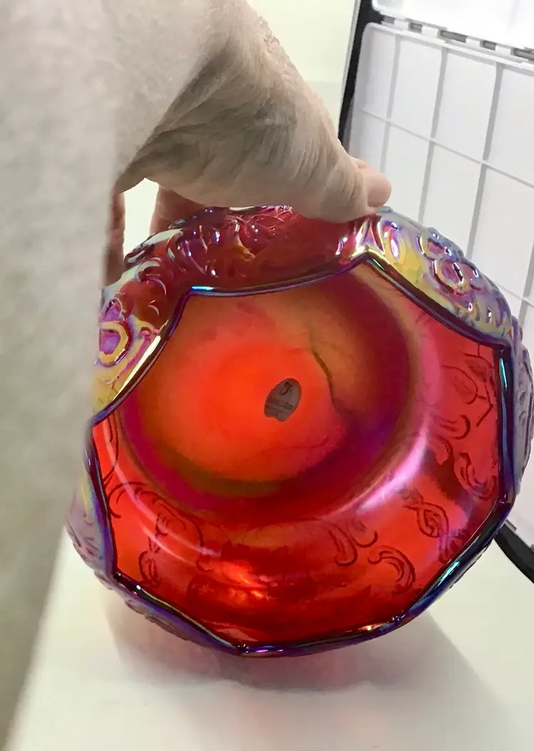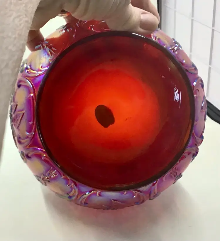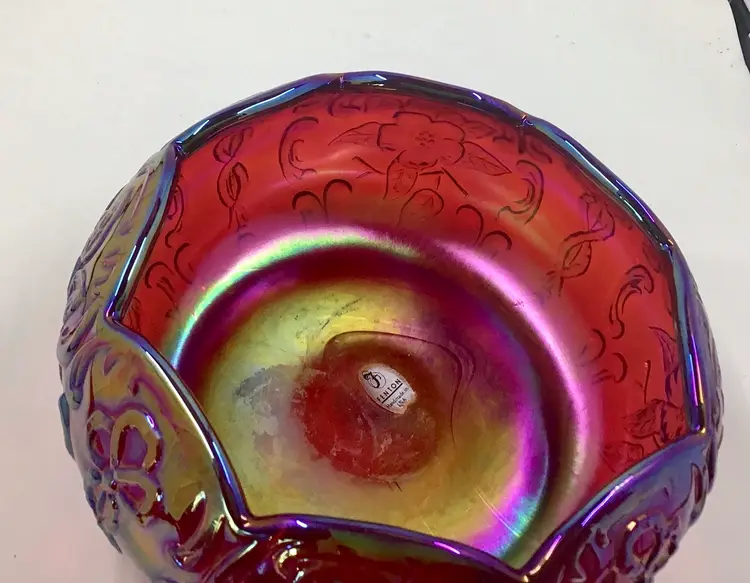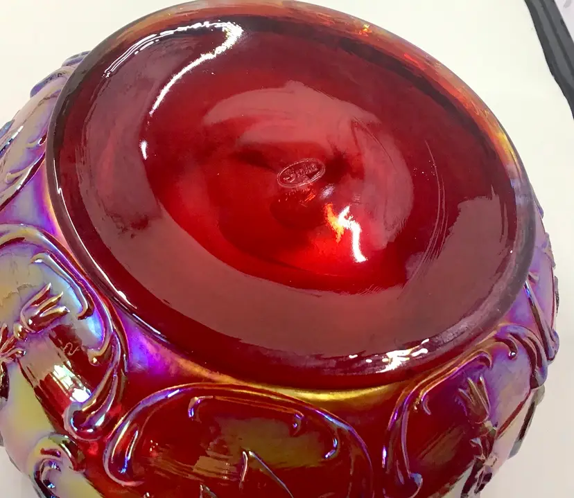 This exquisite vintage Fenton bowl showcases a vibrant red hue paired with an iridescent floral design. This piece is both an artful and functional addition to any space, offering a unique blend of historic craftsmanship and eye-catching aesthetics. A collector's delight, suitable for those who appreciate fine glasswork.