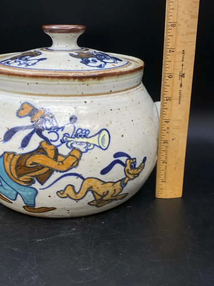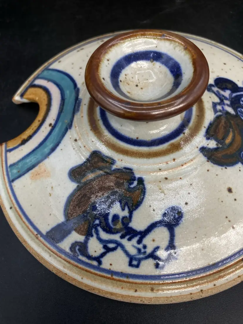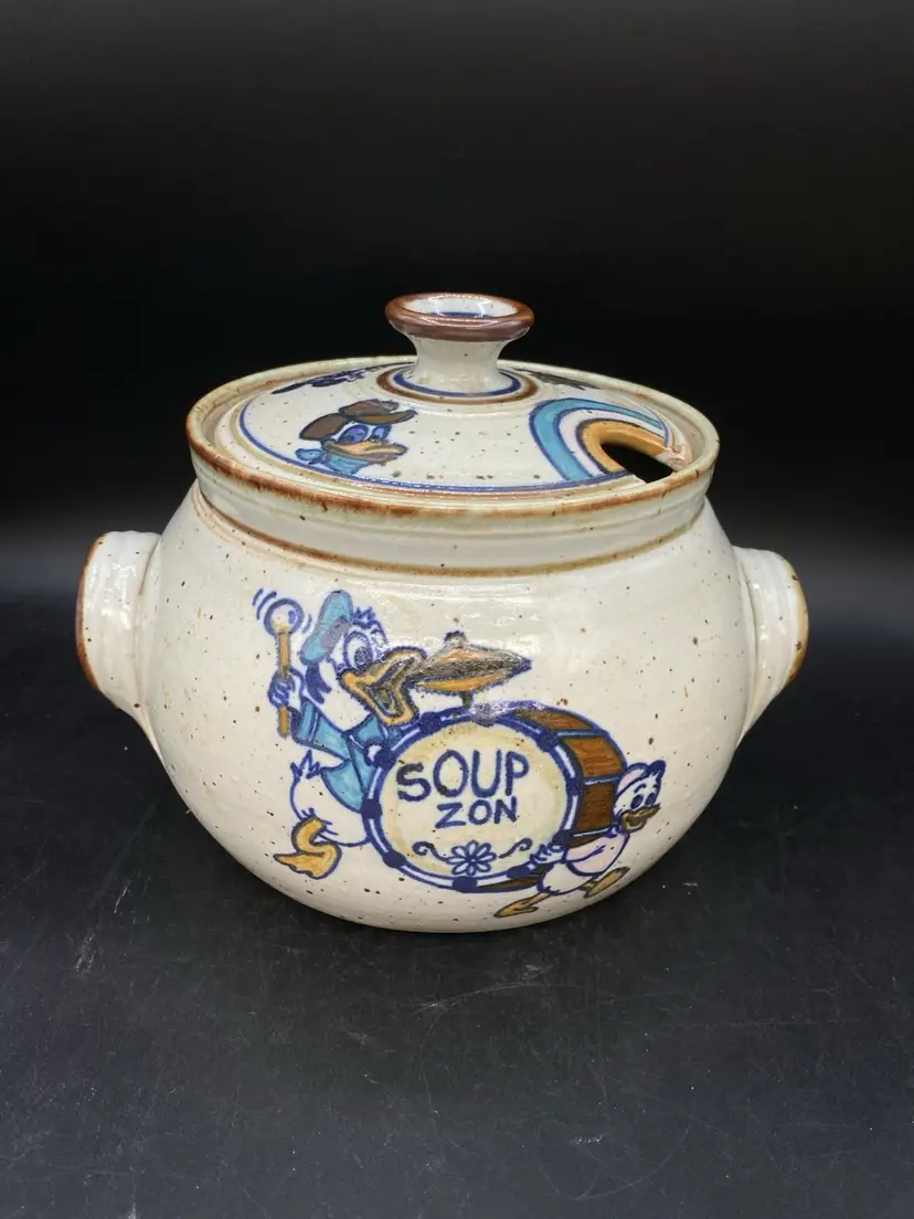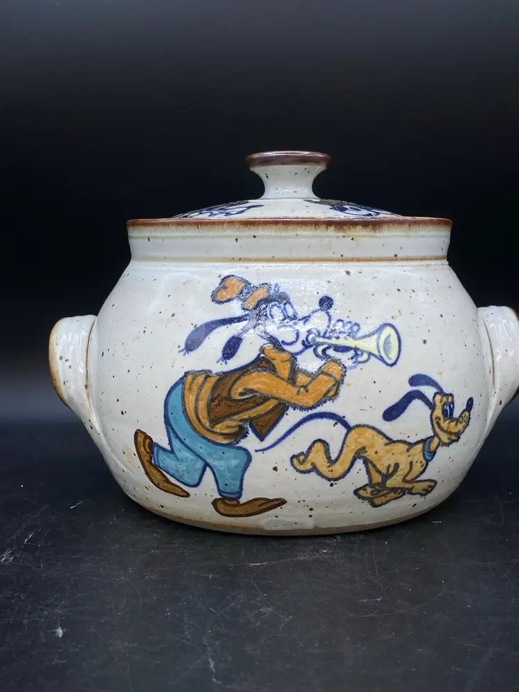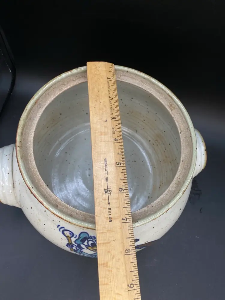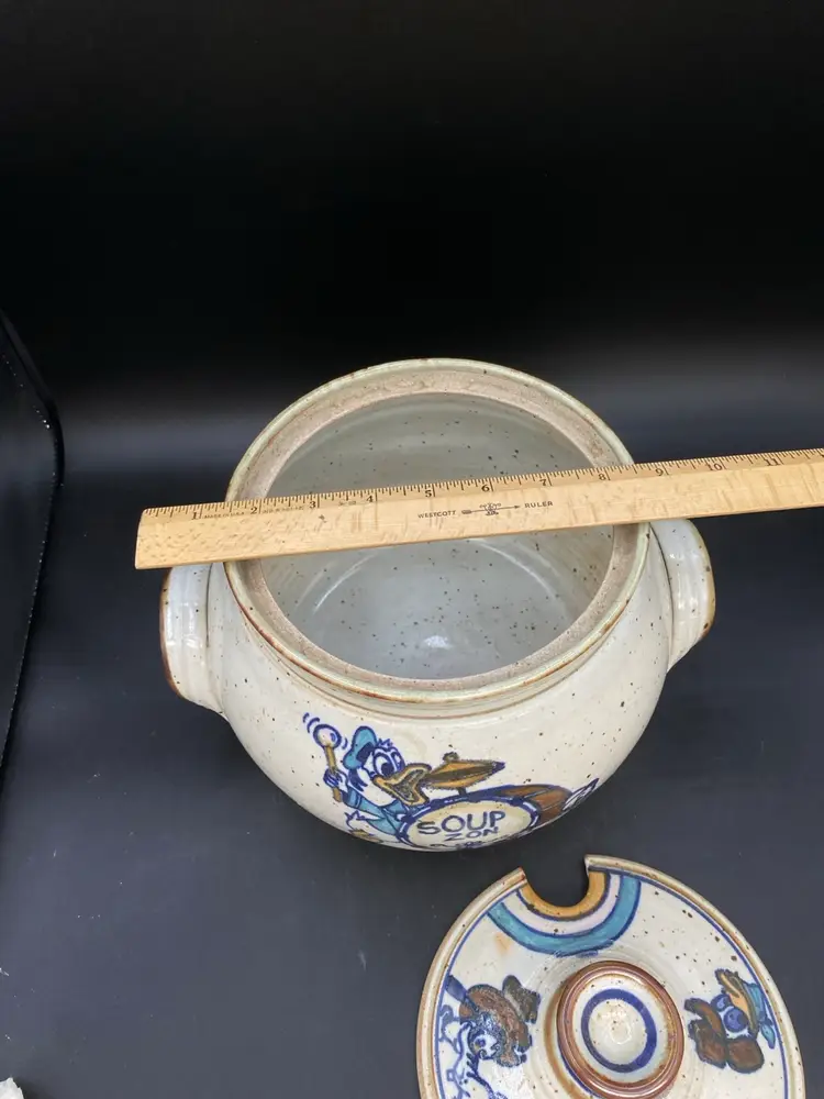 Wildfire Pottery Soup Z On Goofy & Friends Large Soup Tureen Salt Glaze. This is a beautiful piece of salt glaze pottery. It is approximately 12 inches across (handle to handle) the opening is approximately 7 inches almost 8 inches high with the lid on.  It is heavy, and it is going to be packed well in a large box. I have additional pieces of this pottery in my store, but this cannot be combined shipping with anything else. It is too heavy and we will be shipping it separately