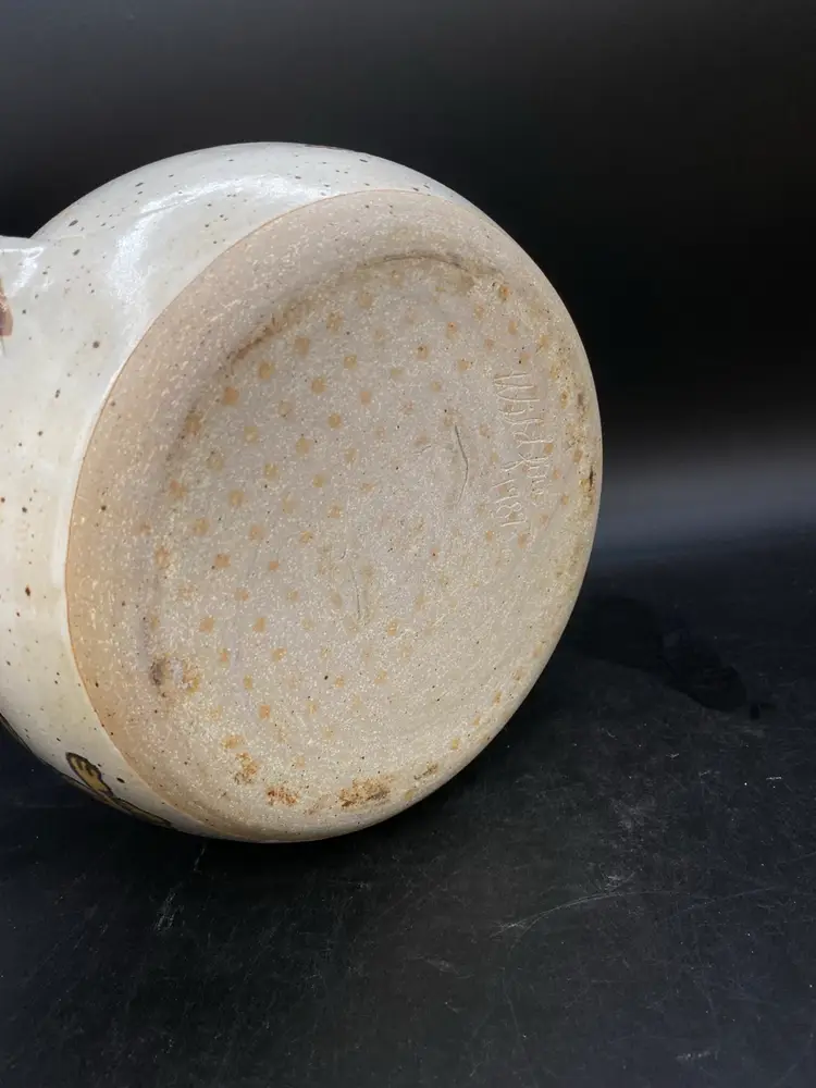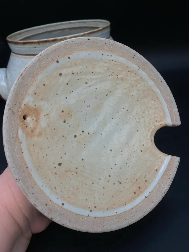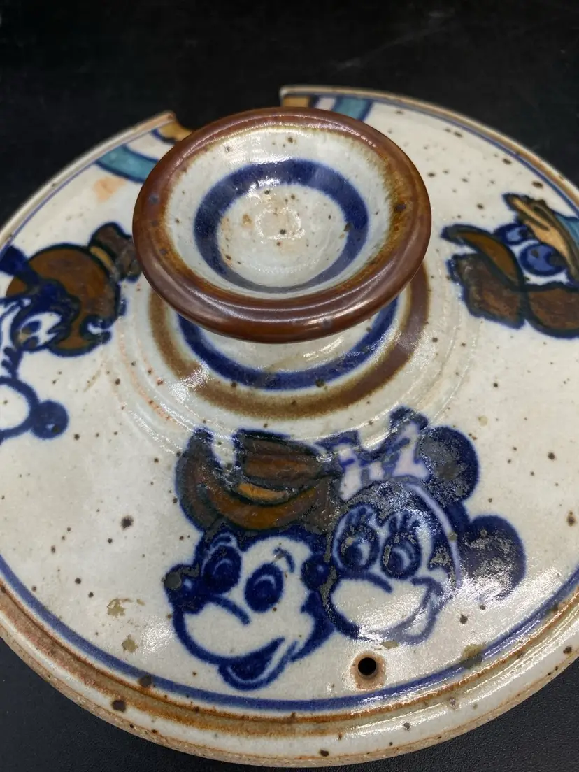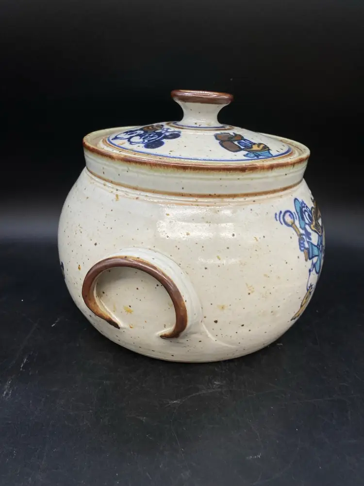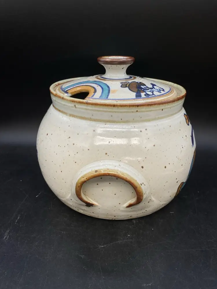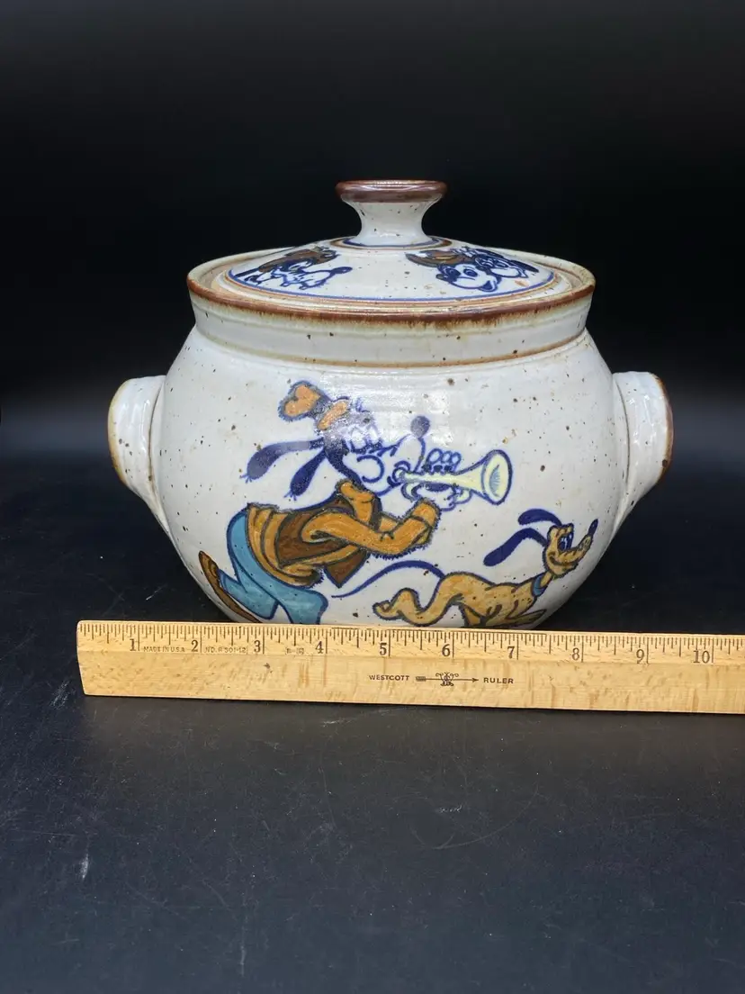 Wildfire Pottery Soup Z On Goofy & Friends Large Soup Tureen Salt Glaze. This is a beautiful piece of salt glaze pottery. It is approximately 12 inches across (handle to handle) the opening is approximately 7 inches almost 8 inches high with the lid on.  It is heavy, and it is going to be packed well in a large box. I have additional pieces of this pottery in my store, but this cannot be combined shipping with anything else. It is too heavy and we will be shipping it separately