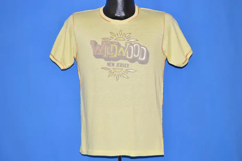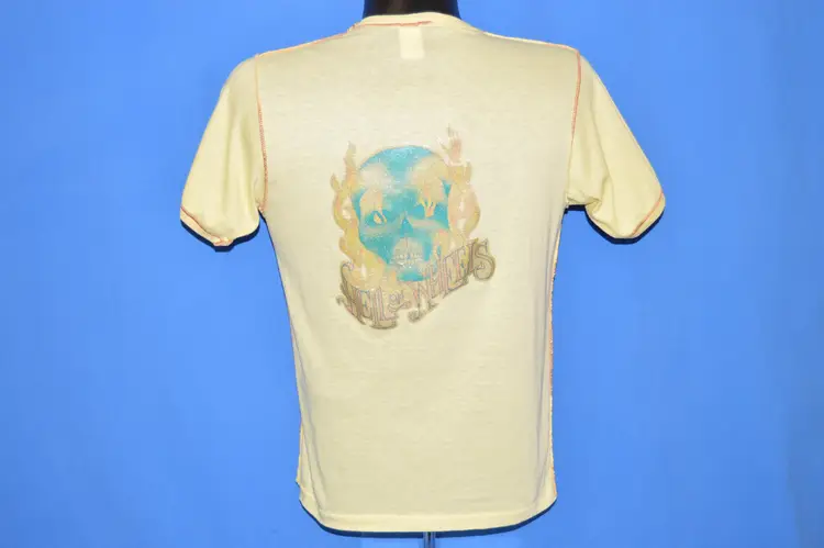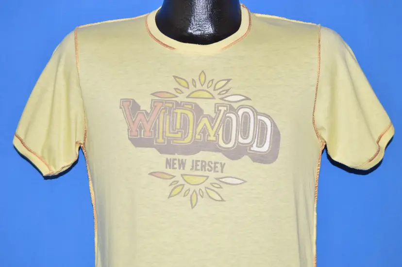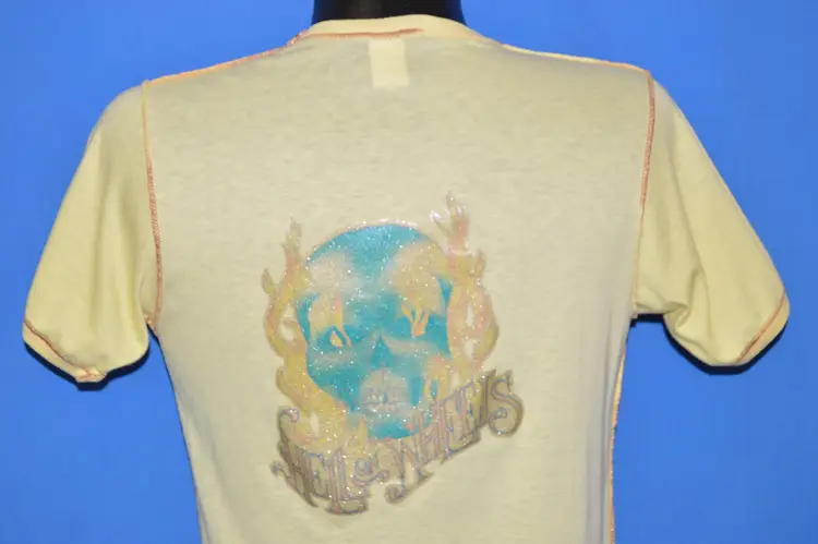 18.5x24.5, Jersey Shore souvenir t-shirt from the 70s, features topstitching and a glitter iron on graphic on the back that says, "Hell on Wheels"