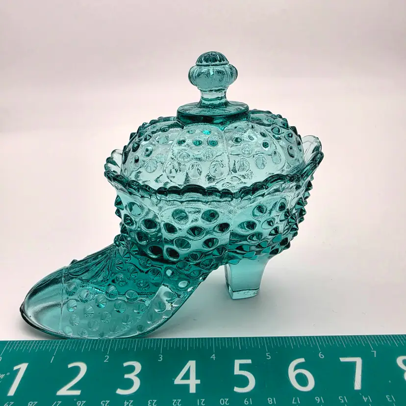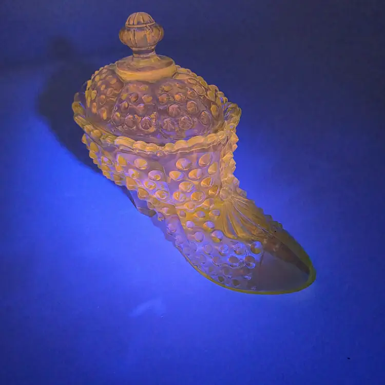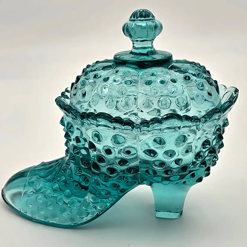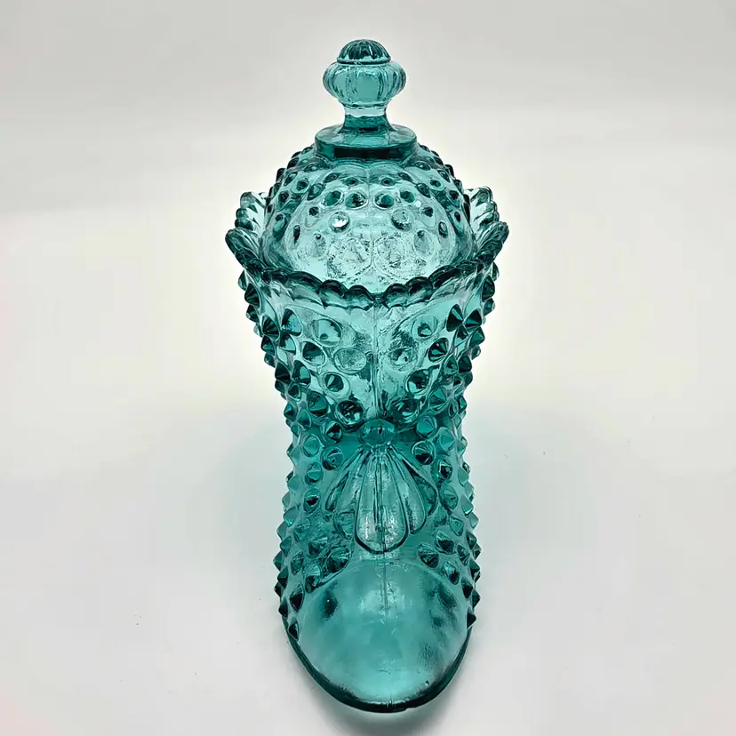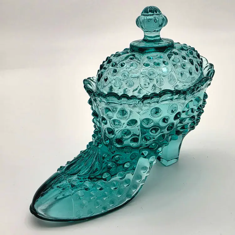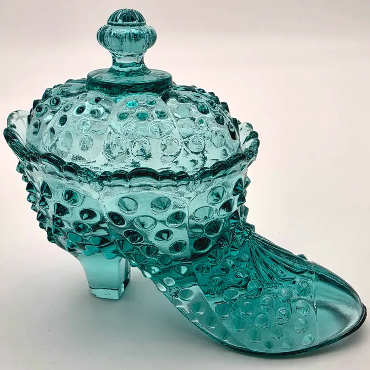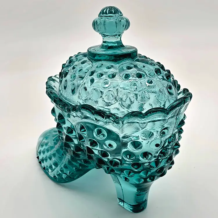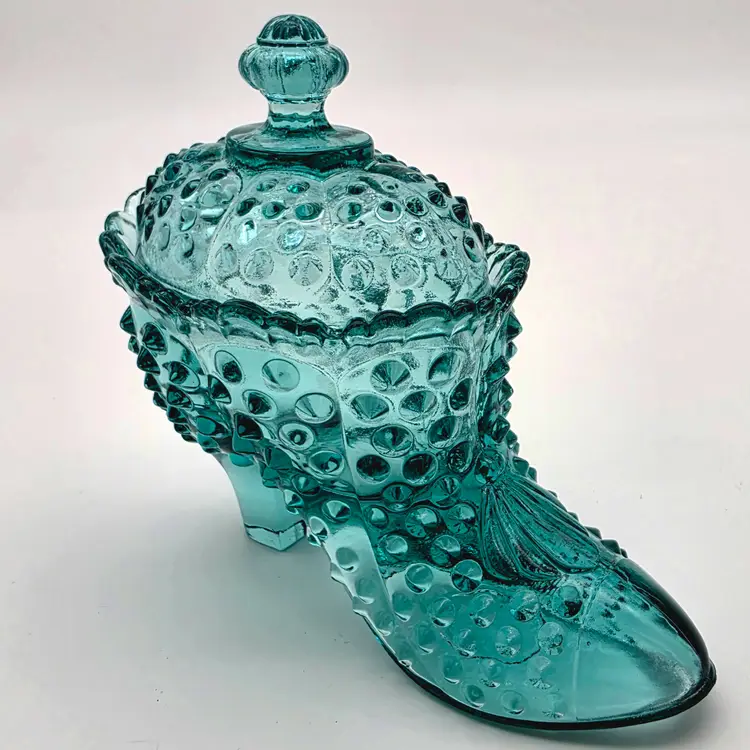 This stunning two-piece covered candy dish is a contemporary treasure made using historical American glassmaking equipment. Produced by the Wilkerson Glass studio in West Virginia, this boot was pressed using an original Fenton Art Glass mould, continuing the legacy of classic Victorian-style "slipper" dishes. The glass features a rich teal hue that is UV reactive. While it appears blue under normal light, it contains selenium, which causes it to glow a brilliant pink under a blacklight. Approximately 5.5" Tall x 6" Long Condition: Perfectly new
