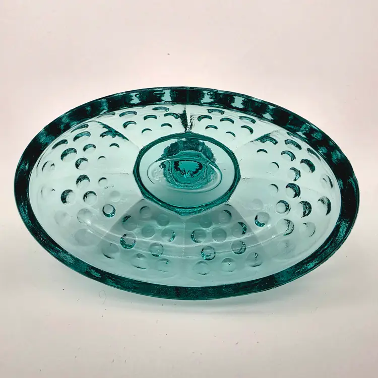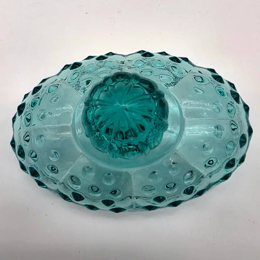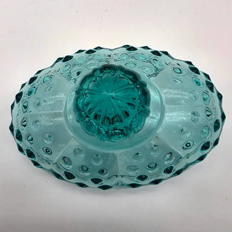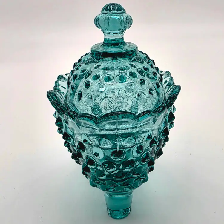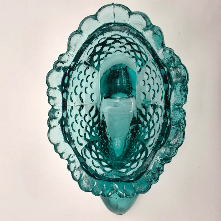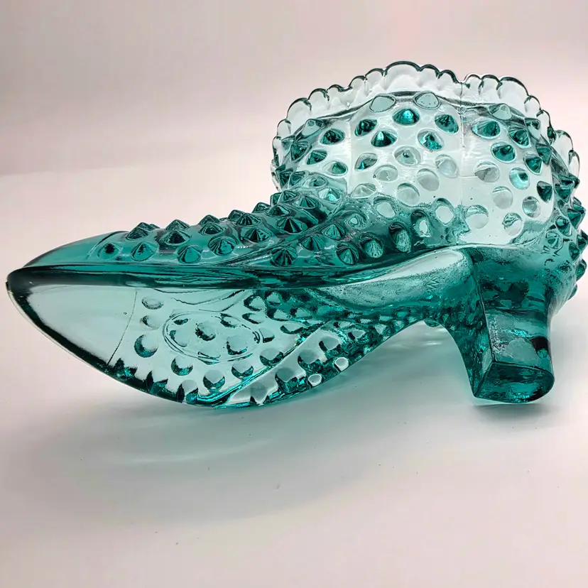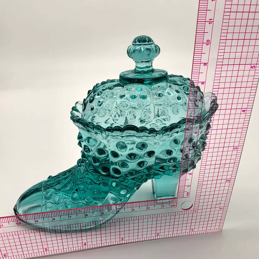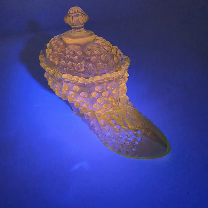 This stunning two-piece covered candy dish is a contemporary treasure made using historical American glassmaking equipment. Produced by the Wilkerson Glass studio in West Virginia, this boot was pressed using an original Fenton Art Glass mould, continuing the legacy of classic Victorian-style "slipper" dishes. The glass features a rich teal hue that is UV reactive. While it appears blue under normal light, it contains selenium, which causes it to glow a brilliant pink under a blacklight. Approximately 5.5" Tall x 6" Long Condition: Perfectly new