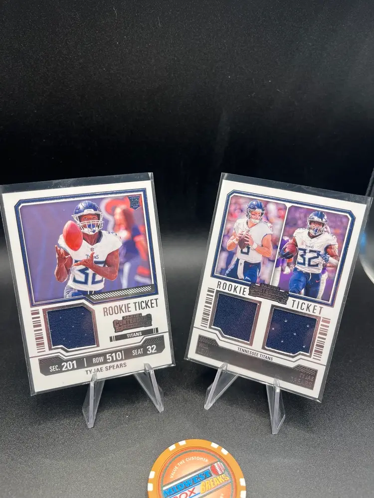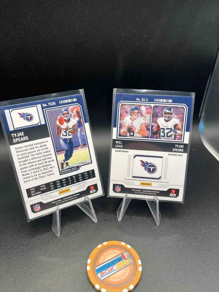 Two rookie patch cards from 2023 Contenders. Tyjae Spears solo patch and Will Levis/Tyjae Spears dual patch card