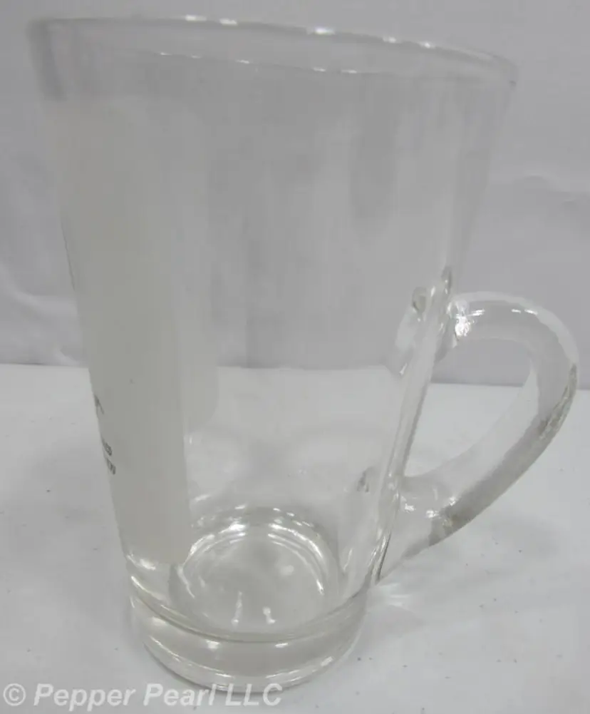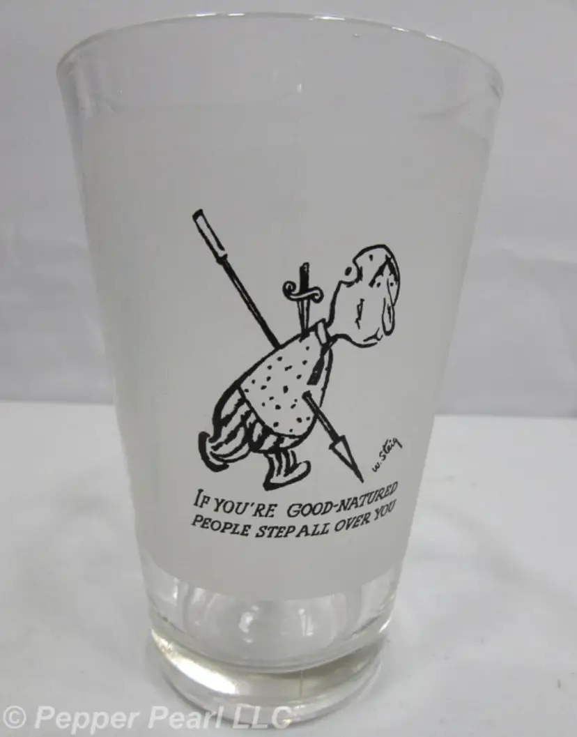 William Steig Irish Coffee Mug Glass "If You're Goo-Natured People Step All Over You" Partly Frosted W. Steig, American Cartoonist, 1907-2003 About 6" tall