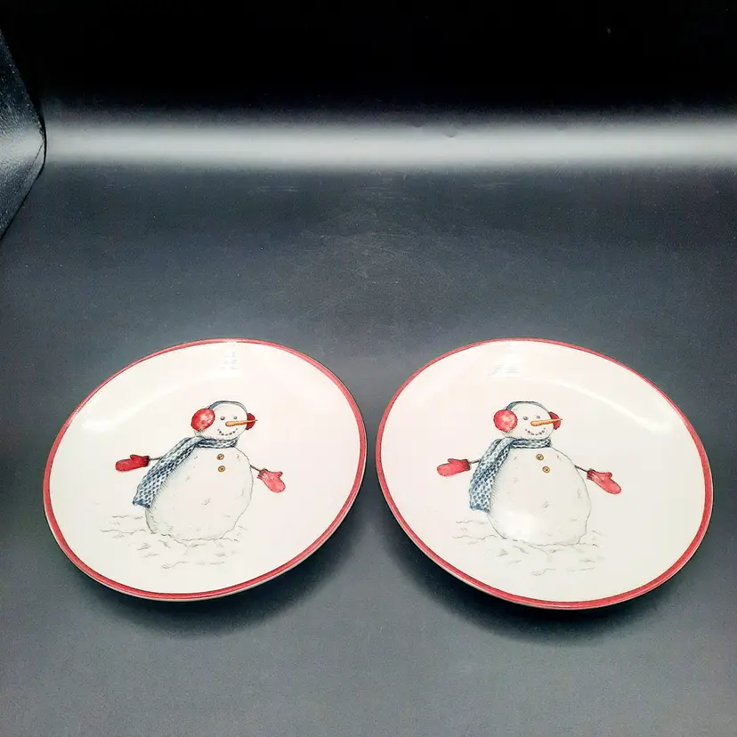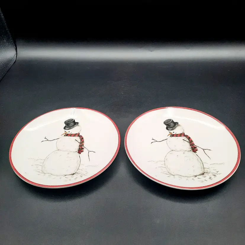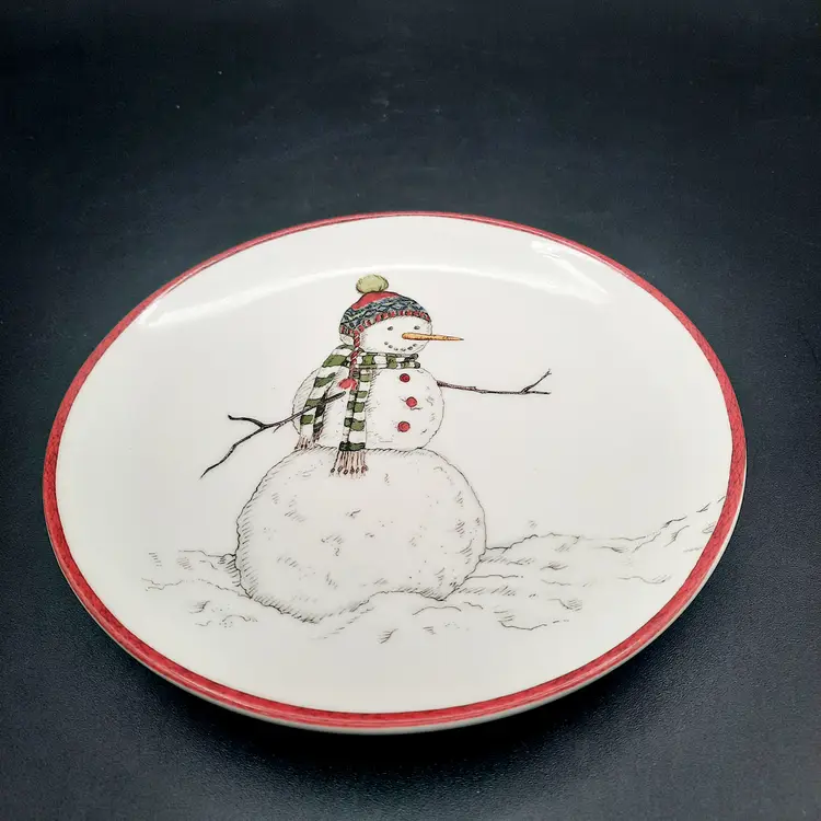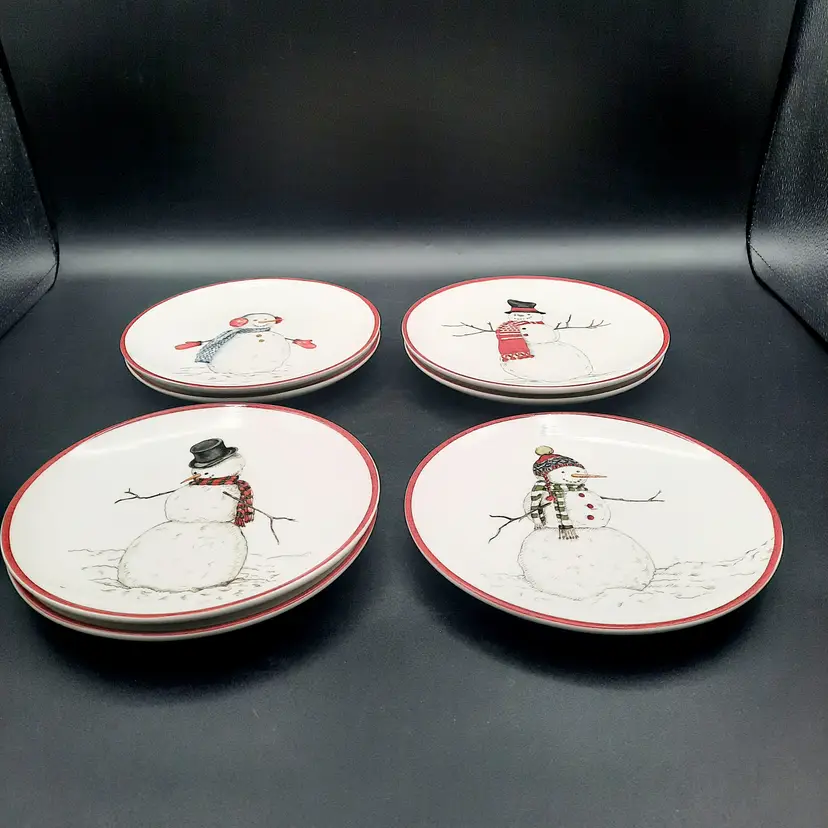 Darling 6 1/2" plates, 4 different snowman designs (one snowman is missing his twin), excellent condition, one plate has some wrinkling/rippling in the finish - mfg flaw