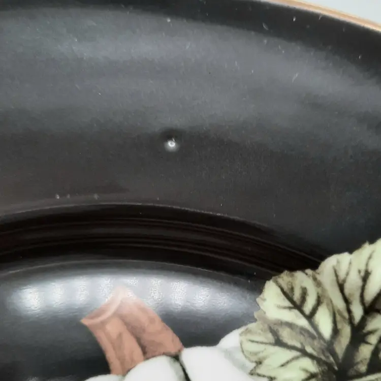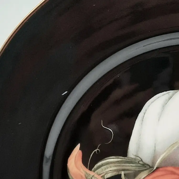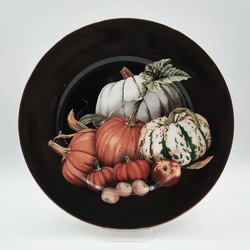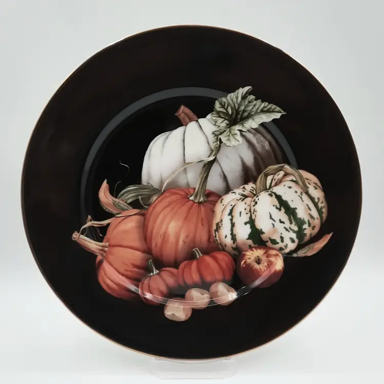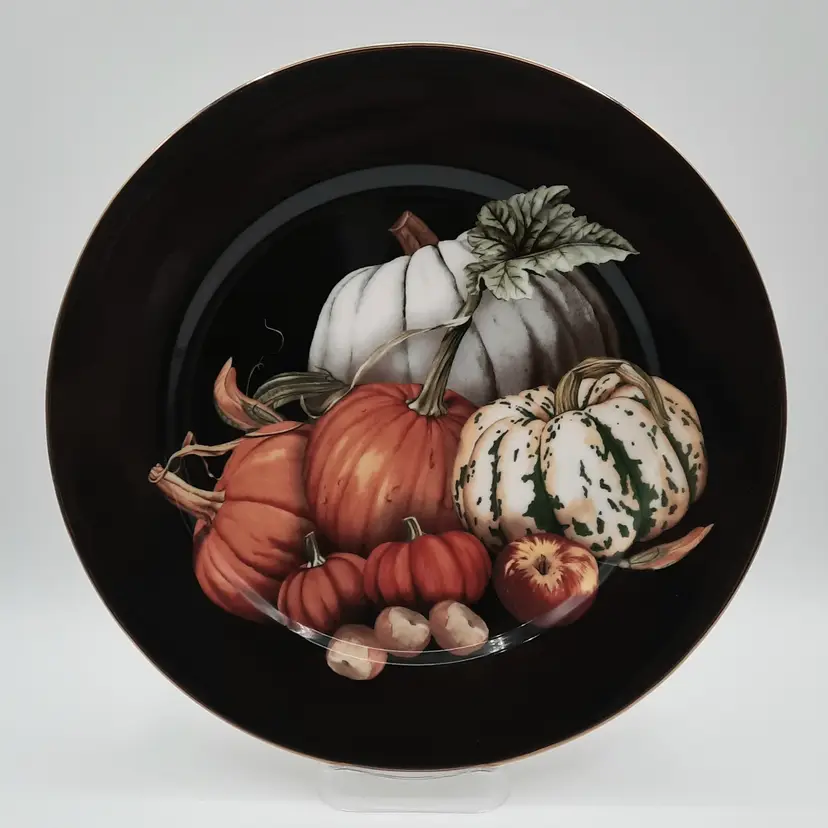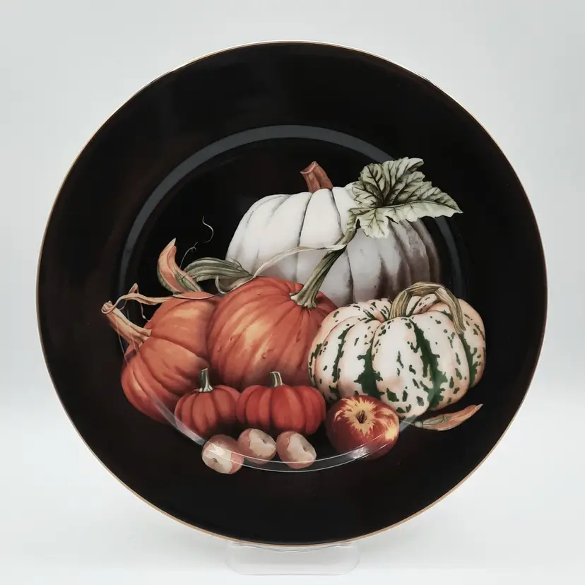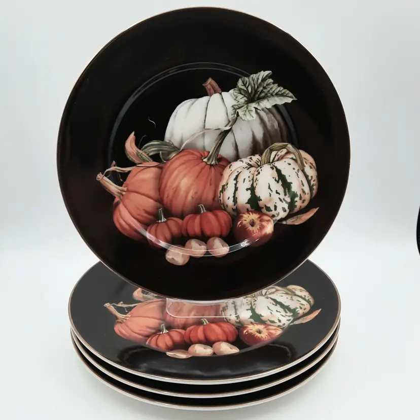 These beautiful 10 1/4" dinner plates are in great condition (still with original stickers on back) - one plate has a small scratch and a pinhole, another plate also has a pinhole. I also have several other pieces of the Harvest Pumpkin listed!