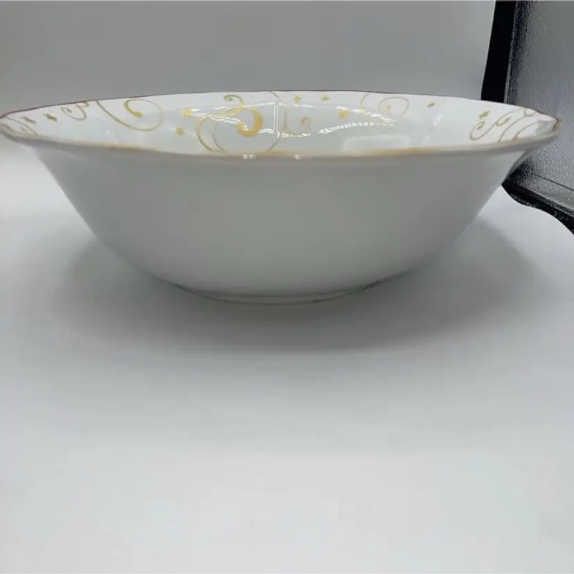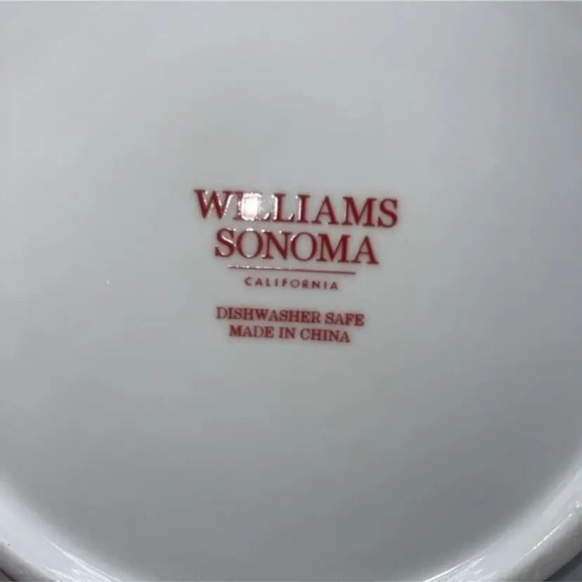 This is a beautiful bowl. It has gold and red around the rim stamped on the bottom is William Sonoma, California dishwasher safe