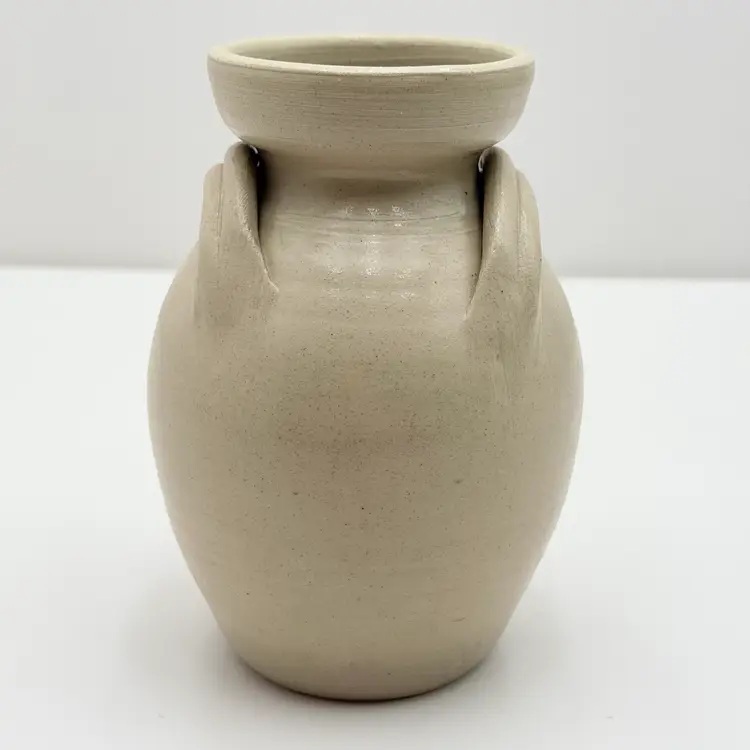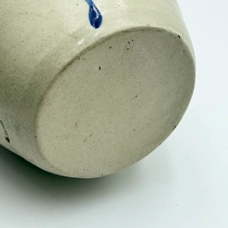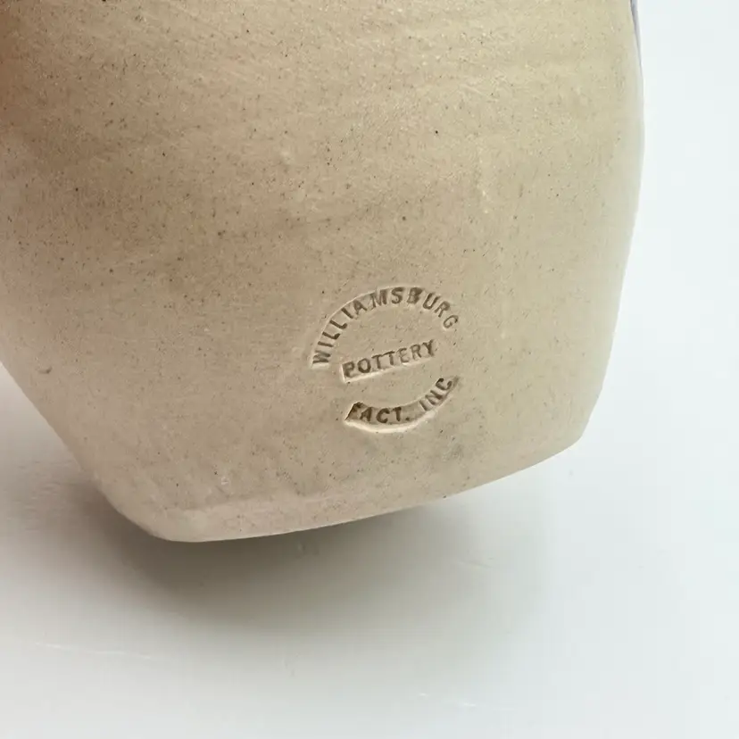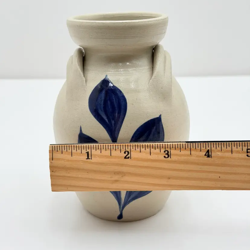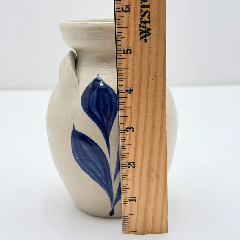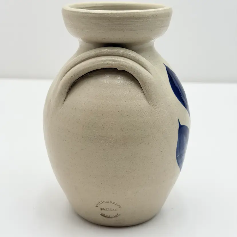 This very pretty salt glaze pottery vase is stamped Williamsburg Pottery. It is a fun design with the double handles on the sides and the pretty cobalt blue leaf across the front. The vase is about 5 ½ inches tall and 3 ½ inches wide at the center. There are no chips or cracks.