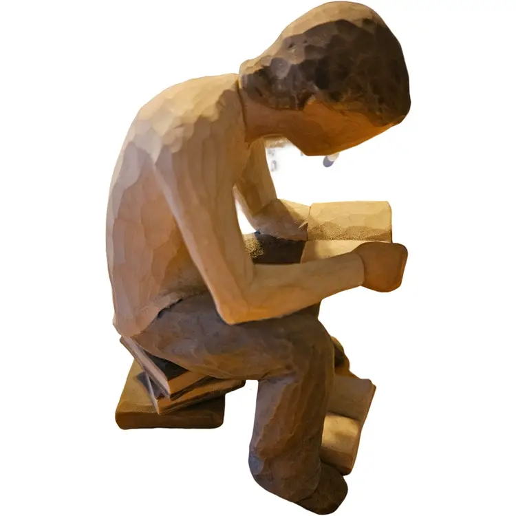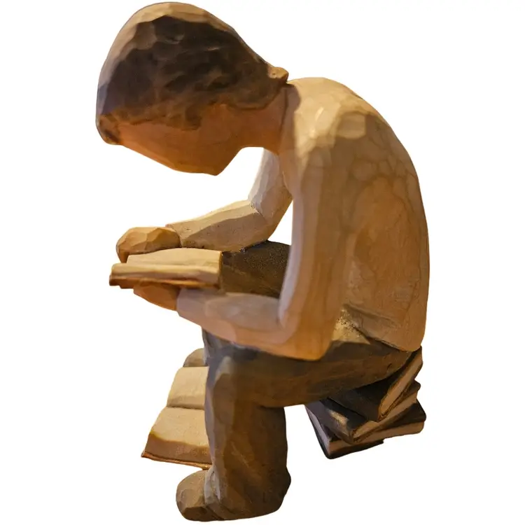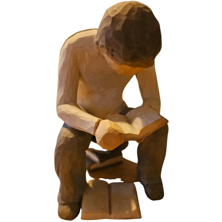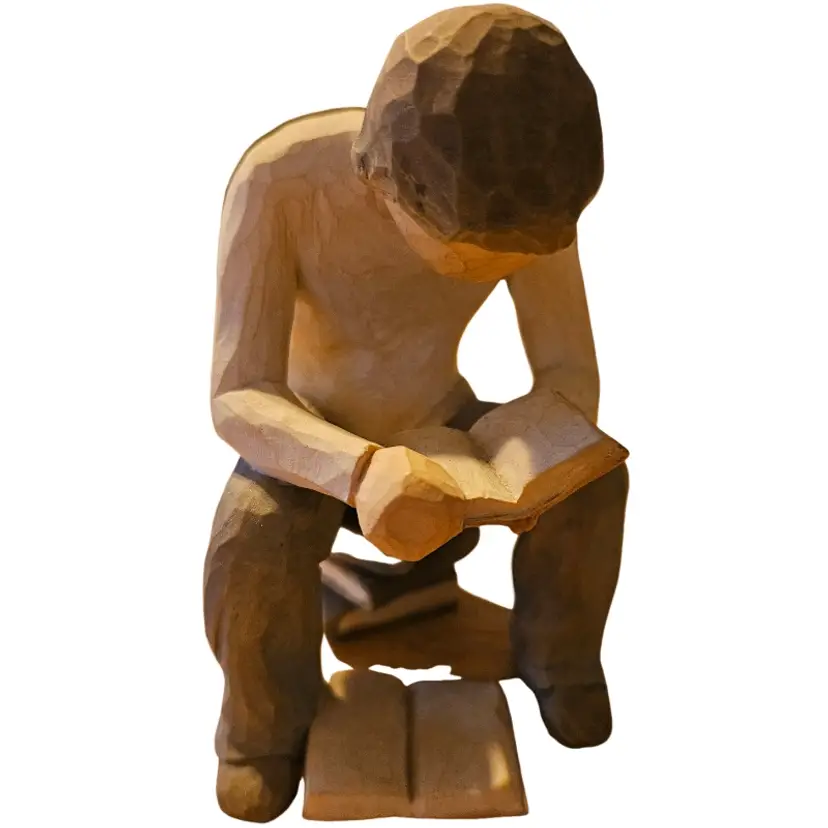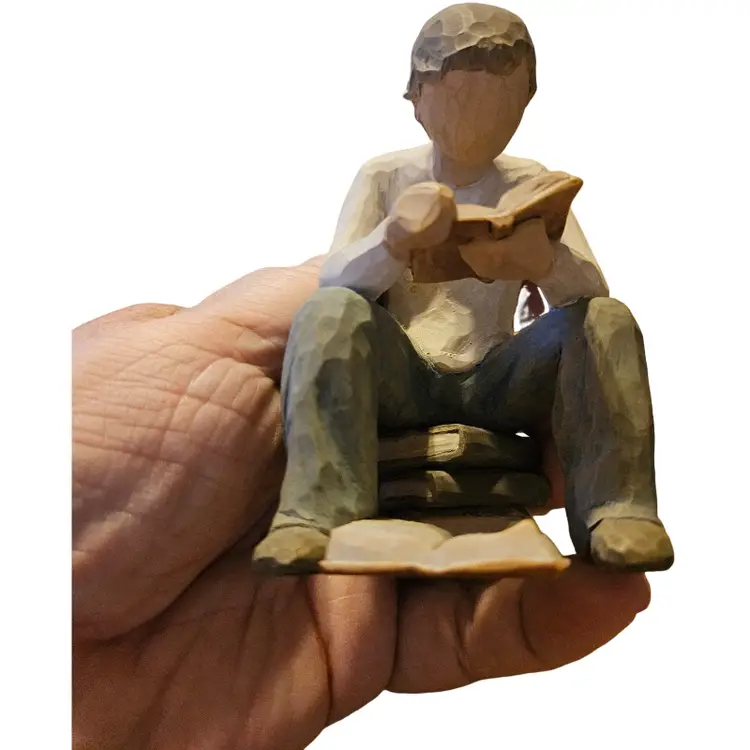 Charming wooden figurine of a boy reading. Crafted with care. Perfect for book lovers.