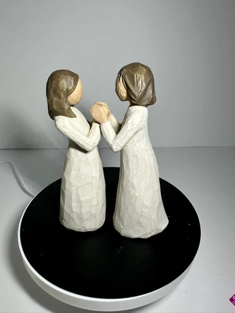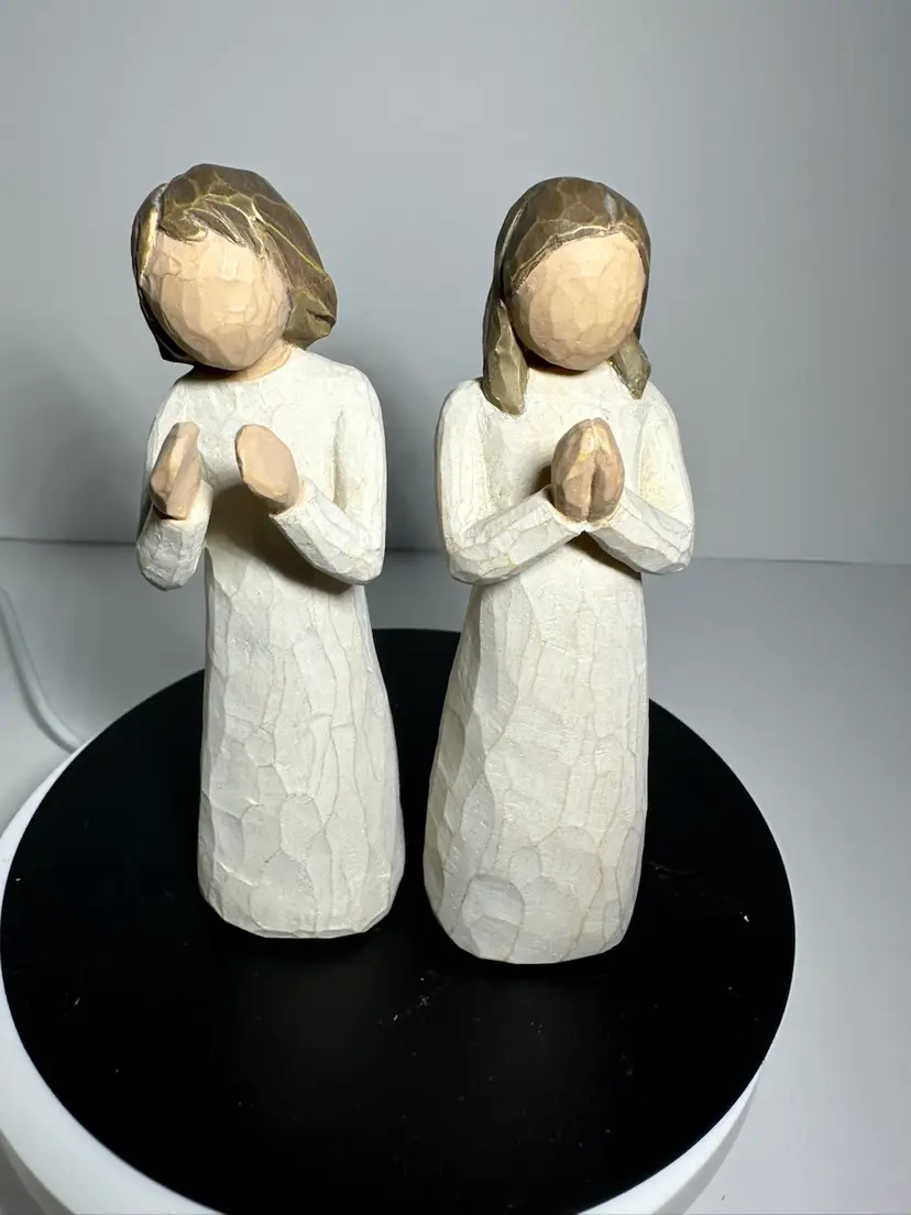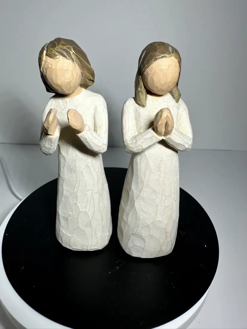 Great condition, each measures 5.5 inches high, their hands fit together. No issues.