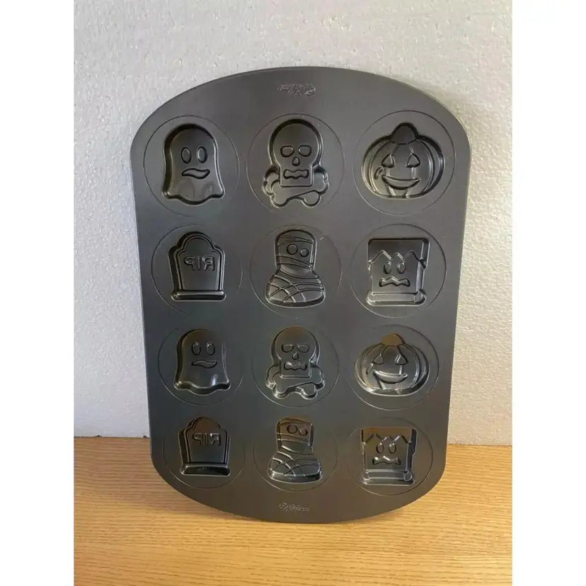 Wilton Halloween Cookie Pan Mini Cake or Candy Mold 12 Separate Holes Ghost Skeleton Pumpkin & More Multipurpose use, cakes, cookies, candy, etc.