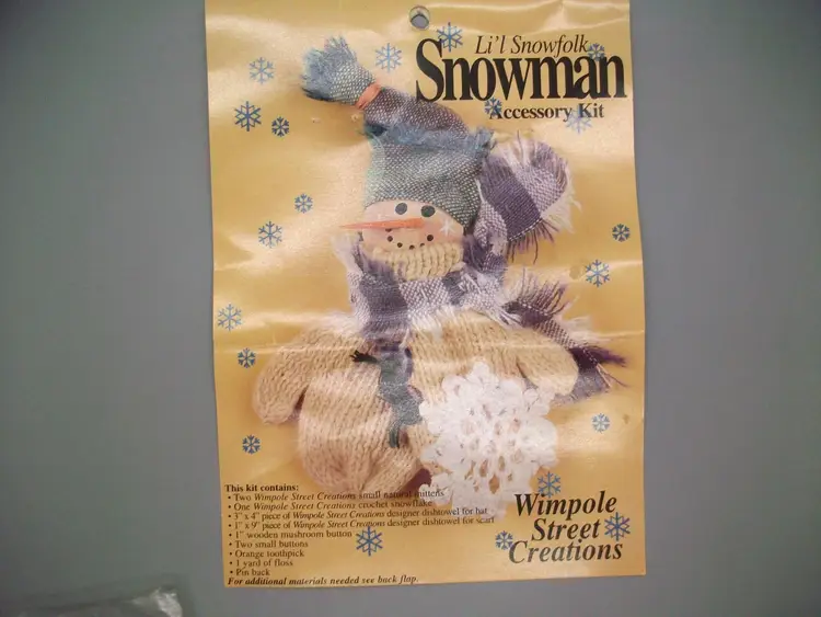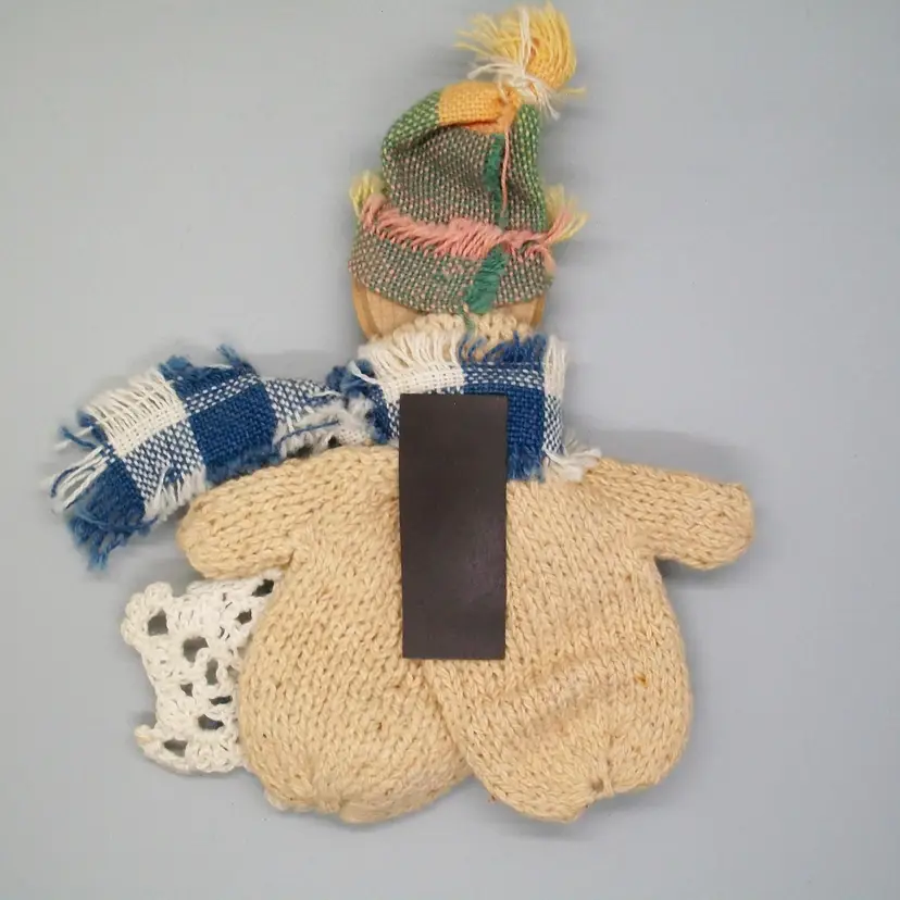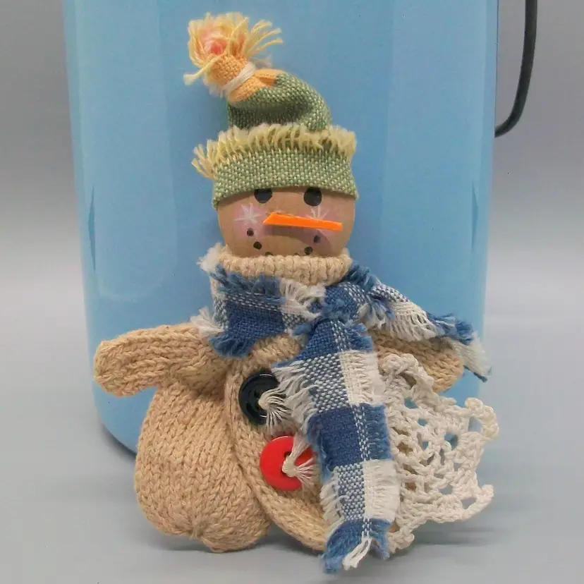 An adorable handmade snowman magnet Wood button head hand painted face orange toothpick nose body made from 2 doll size natural color mittens mini snowflake doily black and red buttons blue plaid check fringed scarf green fabric hat measures approx. 5" tall from tip of hat extra replacement nose and bar pin to convert to lapel pin.