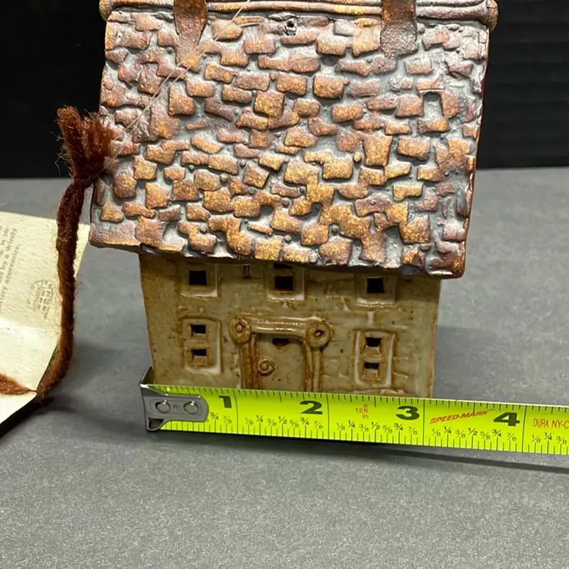 This is a Windy Meadows Pottery ceramic candle house, handmade by artist Jan Richardson. These miniature houses are collectible items, with each piece being hand-constructed without the use of molds.